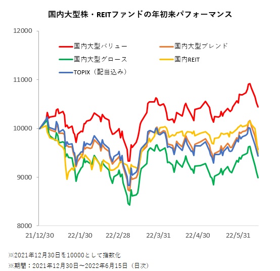 国内資産を例にとって、国内大型株及びREITというリスク資産に投資するファンドの年初来パフォーマンスを見ると、バリュー株ファンドの堅調ぶりが目立つ。米利上げピッチの加速観測などを受けて年初から世界株安基調となる中で、インカム収入などが支えとなった。15日には米FRB(米連邦準備制度理事会)が大幅な利上げを決定したが、今後も大幅利上げが行われる余地は残る。日本を始め世界の株式市場は不安定な推移が見込まれ、国内においてバリュー株ファンドの存在感が一段と高まることもありそうだ。 ウエルスアドバイザーカテゴリー「国内大型バリュー」、「国内大型グロース」、「国内大型ブレンド」、「国内REIT」の6月15日時点の年初来リターン(カテゴリーに属するファンドのリターンの平均)を見ると、「国内大型バリュー」が4.39%のプラスとなった一方、「国内大型グロース」は▲10.12%、「国内大型ブレンド」は▲4.29%、「国内REIT」は▲5.26%といずれもマイナスとなった。 世界の株価は、資源高と供給混乱によるインフレの高進、その抑制のための米利上げピッチの加速観測、ロシアのウクライナ侵攻などを受けて、年初から下落基調が続く。日本を除く世界の先進国の株式に投資するカテゴリー「国際株式・グローバル・除く日本(為替ヘッジなし)」の6月15日時点の年初来リターンは▲6.08%、新興国株式に投資する「国際株式・エマージング・複数国(為替ヘッジなし)」も▲4.00%といずれも低調である。国内外の株式に投資するカテゴリーのパフォーマンスが概ね冴えない中で、配当利回りの高い株式に投資するファンドの多い「国内大型バリュー」は、インカム収入を支えにプラスのリターンを確保している。なお、「国内REIT」は3月下旬から6月上旬までは「国内大型バリュー」に次ぐパフォーマンスであった。金融市場を取り巻く不透明な環境下で、相対的に高い利回りが支えになったと見られる。 FRBは15日、短期金利の指標であるフェデラルファンド(FF)金利の誘導目標を0.75%引き上げた。引き上げ幅は27年7カ月ぶりの大きさである。同日の米国株式市場でNYダウが反発し、16日の国内株式で日経平均株価が反発した。大幅利上げ観測から事前に売り込まれていたためであるが、両市場ともに買い一巡後の上値は重かった。パウエルFRB議長は0.75%の利上げが定着することを否定したが、米国のインフレの動向次第では大幅利上げが続く可能性があり、米景気の冷え込みに対する懸念が広がっている。 日米を中心とする世界の株式市場は、米国の物価や景気関連指標にらみの神経質な展開が続くと見られる。不安定な市場環境の中でも堅調さを発揮してきた国内バリュー株ファンドのパフォーマンスが注目される。