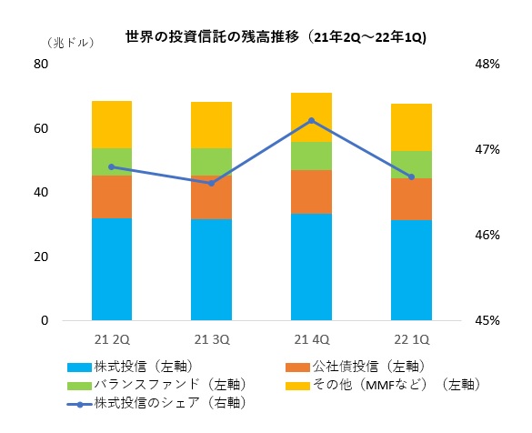 投資信託協会が21日に公表した「投資信託の世界統計2022年第1四半期(1月〜3月)」によると、同四半期末の株式投信の純資産残高は前四半期(2021年第4四半期)末比5.9%減の31兆6500億ドルとなった。金融市場の混乱が響いた。同統計は、国際投資信託協会(IIFA)が46の国・地域から提供されたデータを集計したものである。 第1四半期は、米国の金融政策の引き締め前倒し観測やロシアのウクライナ侵攻などを受けて世界的に株安、債券安となり、投資信託への資金流入も細った。投信全体(株式投信、公社債投信、バランスファンド、MMFなどの合計)の純資金流入額は810億ドルと前四半期の1兆1090億ドルから減少。株価は、世界の株価動向を示す「MSCIオール・カントリー・ワールド・インデックス」が5.73%下落(前四半期は6.39%上昇)し、米国株式市場ではNYダウが4.57%下落(同7.37%上昇)した。債券も、米10年債利回りが2021年12月末の1.51%から2.34%へ上昇(債券価格は下落)し、国内10年債利回りも0.07%から0.21%へ上昇した。 公社債投信の純資産残高は前四半期末比4.9%減の13兆500億ドルとなり4四半期ぶりに減少、バランスファンドも同4.7%減の8兆3700億ドルと2四半期ぶりに減少した。投信全体では同4.6%減の67兆8000億ドルと2四半期ぶりに減少した。 第1四半期末時点の投信全体の残高に占める株式投信残高のシェアは46.7%となった。公社債投信は19.2%、バランスファンドは12.3%となった。
