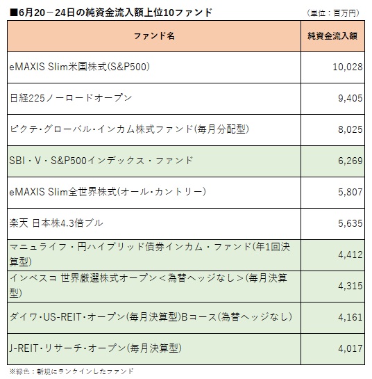 国内公募追加型株式投信(確定拠出年金専用、ファンドラップ専用、及びETF除く)を対象として、ウエルスアドバイザー推計値に基づいて先週(2022年6月20−24日)の純資金流入額上位10ファンドを確認したところ、「eMAXIS Slim米国株式(S&P500)」が2週ぶりのトップとなった。上位10ファンド中5ファンドが先々週(2022年6月13−17日)から入れ替わった。 「eMAXIS Slim米国株式(S&P500)」のほかには、「日経225ノーロードオープン」、「ピクテ・グローバル・インカム株式ファンド(毎月分配型)」、「eMAXIS Slim全世界株式(オール・カントリー)」、「楽天 日本株4.3倍ブル」が先々週に続いてトップ10内となった。 先週新たにトップ10入りしたのは、「SBI・V・S&P500インデックス・ファンド」(愛称:SBI・V・S&P500)、「マニュライフ・円ハイブリッド債券インカム・ファンド(年1回決算型)」、「インベスコ 世界厳選株式オープン<為替ヘッジなし>(毎月決算型)」(愛称:世界のベスト)、「ダイワ・US−REIT・オープン(毎月決算型)Bコース(為替ヘッジなし)」、「J−REIT・リサーチ・オープン(毎月決算型)」の5ファンド。 「SBI・V・S&P500インデックス・ファンド」は今年5月30日−6月3日以来、「マニュライフ・円ハイブリッド債券インカム・ファンド(年1回決算型)」は同4月18−22日以来、「ダイワ・US−REIT・オープン(毎月決算型)Bコース(為替ヘッジなし)」は同5月16―20日以来、「J−REIT・リサーチ・オープン(毎月決算型)」は2020年6月29日−7月3日以来約2年振りにトップ10内に返り咲いた。「インベスコ 世界厳選株式オープン<為替ヘッジなし>(毎月決算型)」は2020年以降で見て初めてのランクインとなった。 一方、先々週トップ10内に入っていたファンドのうち、「ダイワ J−REITオープン(毎月分配型)」、「しんきん インデックスファンド225」、「SBI 日本株4.3ブル」、「楽天・全米株式インデックス・ファンド」(愛称:楽天・バンガード・ファンド(全米株式))、「野村 インデックスファンド・日経225」(愛称:Funds−i 日経225)がトップ10圏外となった。