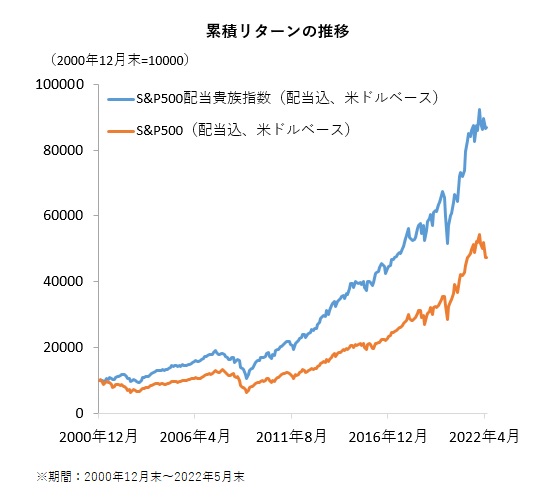 米国株式市場の先行き不透明感が深まる中で、米高配当株式に対する注目が高まりつつある。米高配当株式ファンドが関心を集めることもありそうだ。 直近、米高配当株式に焦点を当てた運用会社のレポートが複数公表されている。いずれも米高配当株式の有する2つの特性に注目している。第一の特性は、相対的な底堅さである。「S&P500(配当込、米ドルベース)」と、S&P500構成銘柄のうち過去25年間連続して増配している銘柄からなる「S&P500配当貴族指数(配当込、米ドルベース)」の6月27日時点における昨年末からの騰落率を見ると、「S&P500」が17.56%下落したのに対して、「S&P500配当貴族指数」の下落率は10.46%に留まっている。相場の下落局面において、安定的な配当収入が支えとなった格好だ。 第二の特性は、長期的に良好なパフォーマンスである。2000年末を起点として2022年5月末までのパフォーマンスを見ると、「S&P500(配当込、米ドルベース)」も4.74倍と良好であったが、「S&P500配当貴族指数(配当込、米ドルベース)」は8.69倍と大幅に上回っている。相対的に高い配当を長期にわたって積み上げたこともあるが、そもそも高配当の原資となる利益を安定的に生み出すことのできる成長力のある企業を構成銘柄としていることが大きい。 米国株式市場では、FRB(米連邦準備制度理事会)の金融引き締め加速による米景気後退が警戒されている。ウクライナ問題は長期化の様相を呈する。米国株式市場が今後も神経質な展開となった場合には、安定的な配当収入による底堅さと長期的に良好なパフォーマンスが見込まれる投資先として米高配当株式が一段と注目を集め、米高配当株式ファンドにも関心が向かうと見られる。