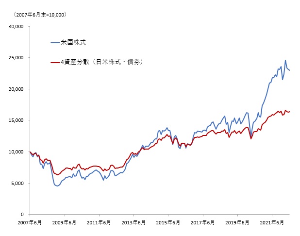 米国株式の値動きが激しい。NYダウは24日の823ドル高の後、27〜28日は続落し、28日の下げ幅は491ドルとなった。FRB(米連邦準備制度理事会)の金融引き締めを受けて米景気減速懸念が拡がり、不安定要因となっている。米国株式は昨年末にかけての世界株高をけん引し、米国株式ファンドには国内投資家の旺盛な資金が流入してきた。米国株式の先行きに黄信号が灯る中、分散投資について考えたい。 米国株式のみに投資した場合と、4資産(日米株式・債券)に均等に分散投資した場合を想定して、シミュレーションを行った。15年前の2007年6月末に投資を開始(同月末=10000)したとして、2022年6月(28日)までのパフォーマンスを確認した。米国株式については、米国株式に投資するウエルスアドバイザーカテゴリー「国際株式・北米(為替ヘッジなし)」に属するファンドのリターンを指数化したウエルスアドバイザーインデックス「国際株式・北米(為替ヘッジなし)(単純)」を使用した。以下、米国債券は同「国際債券・北米(為替ヘッジなし)(単純)」、国内株式は同「国内大型ブレンド(単純)」、国内債券は同「国内債券・中長期債(単純)」を使用した。 15年間の累積リターンを見ると、米国株式のみは129.75%となり、4資産分散の63.61%を大幅に上回った。但し、足元の大幅な差はコロナショック後に米国株式がハイテク株主導で急騰したためである。コロナショック時の2020年3月時点では大きな差は見られず、むしろ、それまでは米国株式のみよりも4資産分散の方が安定的に推移してきたと言える。 また、リーマンショックと欧州債務危機の影響を受けた2008年1月〜2013年10月、中国の景気減速懸念やBrexit(英国の欧州連合からの離脱)に揺れた2016年1〜6月は4資産分散が米国株式を上回った。米国株式が冴えない局面では分散投資によるリスク抑制効果が発揮されたと言える。コロナショック時の2020年3月で見ても、米国株式のみのパフォーマンスが大幅に低下したのに対して、4資産分散の低下幅は限定的である。 ここ数年間の米国株高を支えてきた緩和的な金融政策は終了し、引き締めに転じた。インフレの動向次第では、今後、引き締めペースが加速する可能性もある。米国株式市場を取り巻く環境は大きく変化している。米国株式の先行き不透明感が深まる中、分散投資によるリスク抑制を改めて意識したい。