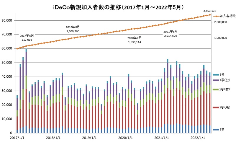 国民年金基金連合会が7月1日に発表したiDeCo(イデコ、個人型確定拠出年金)の業務状況によると、5月の新規加入者数は4万3606人で加入者総数は246万3137人になった。新規加入者数は前年同月比8.5%増となり、例年5月はゴールデンウィークの影響等で加入者が落ち込む月になるが、新年度入りで加入者数が増大しやすい4月と同水準の加入者数になった。なお、従業員のiDeCoに企業が上乗せ拠出をするiDeCo+(中小事業主掛金納付制度)は、実施事業所数は4471事業所、対象従業員数は2万8656人になった。 5月の新規加入者の内訳は、第1号加入者は5445人(前月5848人)、第2号加入者は3万5259人(前月3万6012人)、第3号加入者は2320人(前月2514人)となり、全体的に前月を下回る加入者になった。なお、第2号加入者の中では、企業年金なしの新規加入者が2万3037人(前月2万2277人)。共済組合員(公務員)の新規加入者は6603人(前月8115人)となった。第2号加入者の中で、事業所側のサポートが弱い「企業年金なし」の加入者増が目立っている。 5月末時点の加入者、運用指図者、自動移管者の人数をみると、加入者は前年同月比22.3%増となっているが、掛け金の拠出を止めて運用のみを行う運用指図者は前年同月比11.4%増の79万5894人、また、制度から脱退後に資産の移管手続等をとらずに国民年金基金連合会に強制的に資産移管することになった自動移管者は前年同月比8.8%増の109万9601人になっている。自動移管は、現金に換金されたうえで国民年金基金連合会に預けられ、移管後に毎月52円の管理手数料が目減りしていくことになるなど、加入者にとってデメリットしかない。自動移管者には「自動移管通知」や国民年金基金連合会から「定期通知」が送られているため、その場合は一刻も早くiDeCoの加入者になるなど、資産を活かすための手続きをする必要がある。 iDeCoの新規加入者の拡大は続いているが、自動移管者の人数も増え続けている。むしろ、今年度(2022年度)の累計では、5月末時点で新規加入者が前年同期比99.1%と0.9%減のところ、自動移管者は同108.6%と8.6%増になっている。自動移管の対象となる企業型DC(確定拠出年金)加入者は、会社に制度があれば、自動的に加入し、しかも、掛け金は会社が支払う仕組みになっているため、加入者に加入していることの自覚が小さいという傾向がある。企業型DCに加入しているにも関わらず、運用指図を一度も実行したことがないという人も少なくない。iDeCoの普及によって老後の資産を運用によって大きくしていこうと考える人が増えていることは、高齢社会を突き進む日本にとって望ましいことだといえるが、個人型よりも大きな加入者や運用資産を抱える企業型において、一段と加入者教育が進み、制度を有効活用する加入者を増やす努力が求められているといえるだろう。(グラフは、iDeCo新規加入者の推移)
