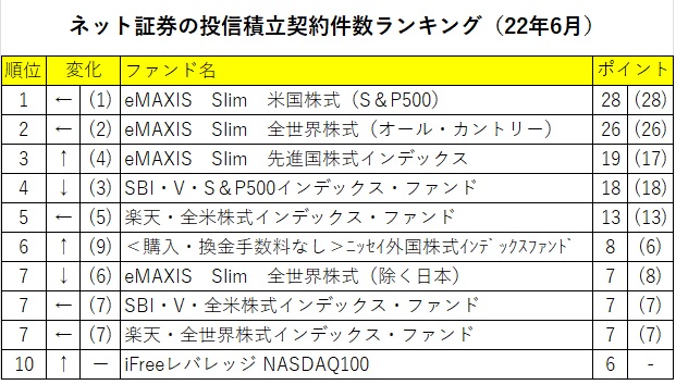 大手ネット証券3社の投信積立契約件数ランキング(月次、22年6月)のトップ3は「eMAXIS Slim 米国株式(S&P500)」、「eMAXIS Slim 全世界株式(オール・カントリー)」、「eMAXIS Slim 先進国株式」になった。「eMAXIS Slim」シリーズがトップ3を独占するのは、2021年8月以来10か月ぶりのこと。この間、トップ3に食い込むことが多かった「SBI・V・S&P500インデックス・ファンド」は4位に後退した。また、前月は9位にまで順位を落としていた「<購入・換金手数料なし>ニッセイ外国株式インデックスファンド」が6位に浮上。トップ10圏外から「iFreeレバレッジNASDAQ100」が10位に躍進した。 ランキングは、定期的に月次の投信積立契約件数トップ10を公表しているSBI証券、楽天証券、マネックス証券の公開情報を使用。各社ランキング1位に10点、以下、順位が落ちるたびに1点を減点し、第10位を1点として、3社のランキング10位までのファンドの点数を集計した。 長期に資産を積み立てていくことを目的とした投信積立では、長期的に見て資産の成長が期待される「株式」を投資対象としたファンドが選択されるとともに、継続的な負担となる信託報酬率を低く抑えることが重視される傾向にある。この2つの傾向を兼ね備えた「株式インデックスファンド」が積立契約件数のメイン商品となっている。特に、22年4月以降は、株式インデックスファンドへの需要が強まり、4月、5月と2カ月連続で、株式インデックスファンドがトップ10を独占する状況が続いた。株式インデックスファンドの中でも、業界に先駆けて「業界最低水準の信託報酬をめざす」と宣言した「eMAXIS Slim」シリーズが絶大な人気を誇っている。6月のトップ10の中でも4銘柄を占めた。 一方、株式インデックスファンドの対抗馬となっているのが、「ひふみプラス」に代表される株式アクティブファンド、そして、「iFreeレバレッジNASDAQ100」などのレバレッジ型のファンドだ。「ひふみプラス」は22年3月にトップ10の第7位になったことを最後にトップ10圏外に落ちた。また、レバレッジ型は21年12月に「iFreeレバレッジNASDAQ100」が第6位になったことを最後にトップ10から外れてきた。今回、「iFreeレバレッジNASDAQ100」が6カ月ぶりにトップ10に返り咲いた。株式アクティブファンドやレバレッジ型は、株式インデックスファンドと比較すると信託報酬率が高いため、これらのファンドがトップ10を動かすときは、投資家の市場の見方に変化が出てきた兆しと考えられる。 米国のNASDAQ総合指数は、今年1月3日の1万5832.79ポイントをピークに下落し、6月30日には1万1028.73ポイントまで30%超の下落率になった。6月の月間下落率も8.71%となり、3か月連続の下落。第2四半期累計で22.44%の下落率と、リーマンショックで下落した2008年第4四半期以来の大幅安を記録している。この下落率の大きさに、底入れを期待する投資家が、より戻り率が大きくなることが期待されるレバレッジ型を選択しているのだろう。今後、この動きが他のレバレッジ型やアクティブファンドにまで波及するものか、注目したい。