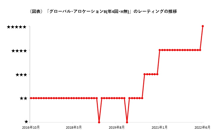 アセットマネジメントOneの「グローバル・アロケーション・オープンBコース(年4回決算・為替ヘッジなし)」(グローバル・アロケーションB(年4回・H無))は2022年6月、ファンドレーティングで5ツ星を獲得した。2016年10月の付与開始から69カ月目で初の5ツ星となる。2021年1月から前月までは17カ月連続で4ツ星であった。 ウエルスアドバイザーでは毎月上旬に、前月末時点のレーティングを公表している。レーティングは、運用期間3年以上のファンドを対象として、リスク調整後のリターンがその属するウエルスアドバイザーカテゴリー内でどの水準にあるのかを5段階で示したもの。最上位の5ツ星は、そのファンドが相対的な運用効率に優れていることを示す。 同ファンドは、外国籍ファンドへの投資を通じて、実質的に世界各国の株式と債券などに分散投資するバランスファンド。外国籍ファンドでは、資産配分は株式60%、債券40%を、国別配分は北米60%、その他40%を目安とする。外国籍ファンドの運用はブラックロック・インベストメント・マネジメントが行う。外国籍ファンドの2022年5月末時点のポートフォリオを見ると、資産構成比率は株式等53.3%、債券16.3%、キャッシュその他30.3%など。金利上昇を踏まえて米国や先進国の国債をアンダーウェイトしているほか、リスクに備えて現金の比率を高めている。 2022年6月末時点の過去5年間のトータルリターン(年率)は7.26%とウエルスアドバイザーカテゴリー「バランス」平均を2.42%上回り、カテゴリー内上位9%(196本中16位)となっている。