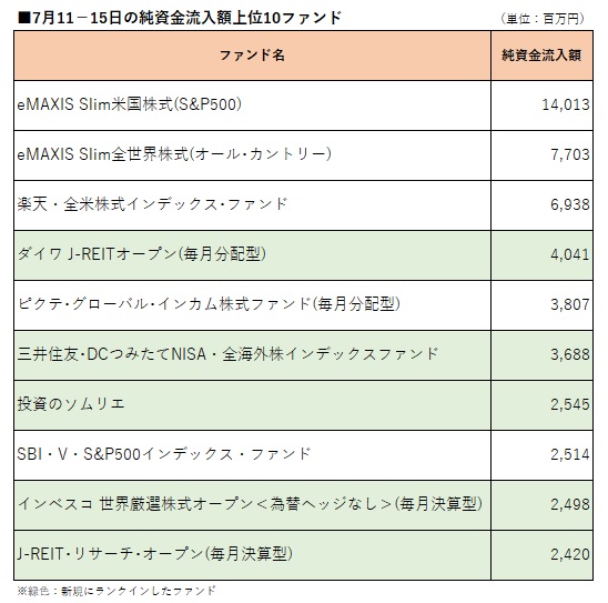 国内公募追加型株式投信(確定拠出年金専用、ファンドラップ専用、及びETF除く)を対象として、ウエルスアドバイザー推計値に基づいて先週(2022年7月11−15日)の純資金流入額上位10ファンドを確認したところ、「eMAXIS Slim米国株式(S&P500)」が2週連続のトップとなった。また、5ファンドがトップ10内に返り咲いた。 「eMAXIS Slim米国株式(S&P500)」は140億円の純資金流入となった。ほかには、「eMAXIS Slim全世界株式(オール・カントリー)」、「楽天・全米株式インデックス・ファンド」(愛称:楽天・バンガード・ファンド(全米株式))、「ピクテ・グローバル・インカム株式ファンド(毎月分配型)」、「SBI・V・S&P500インデックス・ファンド」(愛称:SBI・V・S&P500)が先々週(2022年7月4−8日)に続いてトップ10内となった。 先々週トップ10内に返り咲いたのは、「ダイワ J−REITオープン(毎月分配型)」、「三井住友・DCつみたてNISA・全海外株インデックスファンド」、「投資のソムリエ」、「インベスコ 世界厳選株式オープン<為替ヘッジなし>(毎月決算型)」(愛称:世界のベスト)、「J−REIT・リサーチ・オープン(毎月決算型)」。 「ダイワ J−REITオープン(毎月分配型)」と「J−REIT・リサーチ・オープン(毎月決算型)」は6月27日−7月1日以来2週ぶり、「インベスコ 世界厳選株式オープン<為替ヘッジなし>(毎月決算型)」は6月20−24日以来3週ぶりのランクイン、「三井住友・DCつみたてNISA・全海外株インデックスファンド」と「投資のソムリエ」は1月11−14日以来半年ぶりのランクインとなった。 「三井住友・DCつみたてNISA・全海外株インデックスファンド」は「MSCIオール・カントリー・ワールド・インデックス(除く日本、配当込み、円ベース)」をベンチマークとする。「投資のソムリエ」は毎年1月と7月の年2回決算を行う。7月11日に決算を行い、分配金額を80円(1万口当たり、税引前)とした。