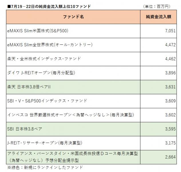 国内公募追加型株式投信(確定拠出年金専用、ファンドラップ専用、及びETF除く)を対象として、ウエルスアドバイザー推計値に基づいて先週(2022年7月19−22日)の純資金流入額上位10ファンドを確認したところ、「eMAXIS Slim米国株式(S&P500)」が3週連続のトップとなった。3ファンドがトップ10内に返り咲いた。 「eMAXIS Slim米国株式(S&P500)」は71億円の純資金流入となった。ほかには、「eMAXIS Slim全世界株式(オール・カントリー)」、「楽天・全米株式インデックス・ファンド」(愛称:楽天・バンガード・ファンド(全米株式))、「ダイワ J−REITオープン(毎月分配型)」、「SBI・V・S&P500インデックス・ファンド」(愛称:SBI・V・S&P500)、「インベスコ 世界厳選株式オープン<為替ヘッジなし>(毎月決算型)」(愛称:世界のベスト)、「J−REIT・リサーチ・オープン(毎月決算型)」が先々週(2022年7月11−15日)に続いてトップ10内となった。 先週トップ10内に返り咲いたのは、「楽天 日本株3.8倍ベアII」、「SBI 日本株3.8ベア」、「アライアンス・バーンスタイン・米国成長株投信Dコース毎月決算型(為替ヘッジなし)予想分配金提示型」(AB・米国成長株投信Dコース(H無)予想分配金)の3ファンド。いずれも、6月6−10日以来6週ぶりのランクインとなった。 「楽天 日本株3.8倍ベアII」と「SBI 日本株3.8ベア」は、ともに株価指数先物取引を積極的に活用することで、日々の基準価額の値動きが国内株式市場全体の値動きの概ね3.8倍程度逆となることを目指して運用する。先週は日米株式ともに上昇し、中でも、日経平均株価が22日に7日続伸して6月9日以来の高値水準となるなど、日本株の上昇が目立った。両ファンドには、日本株の上昇一服後の下落を見込んだ資金が流入したと見られる。 一方、先々週ランクインしていたファンドのうち、「ピクテ・グローバル・インカム株式ファンド(毎月分配型)」、「投資のソムリエ」、「三井住友・DCつみたてNISA・全海外株インデックスファンド」がトップ10圏外となった。