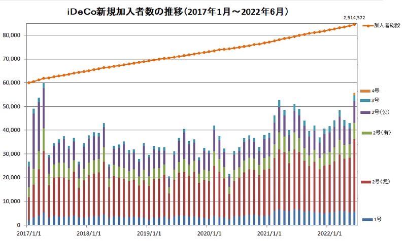 国民年金基金連合会が8月1日に発表したiDeCo(イデコ、個人型確定拠出年金)の業務状況によると6月の新規加入者数は5万5810人で加入者総数は251万4572人になった。新規加入者数は前年同月比9.2%増となり、5.58万人の新規加入者数は、2017年1月にiDeCoの加入対象者が公務員や専業主婦(夫)(第3号被保険者)などに拡大し、iDeCo加入がブームになった2017年4月のピーク5万9918人に迫る新規加入者数になった。また、今回の開示資料から、「第4号」(国民年金任意加入被保険者=拠出限度額6万8000円)の加入者状況が追加された。なお、従業員のiDeCoに企業が上乗せ拠出をするiDeCo+(中小事業主掛金納付制度)は、実施事業所数は4567事業所、対象従業員数は2万9554人になった。 6月の新規加入者の内訳は、第1号加入者は5785人(前月5445人)、第2号加入者は4万6374人(前月3万5259人)、第3号加入者は2562人(前月2320人)となった。第2号加入者の中では、企業年金なしの新規加入者が3万524人(前月2万3037人)。共済組合員(公務員)の新規加入者は9007人(前月6603人)となった。第2号加入者の中で、事業所側のサポートが弱い「企業年金なし」の新規加入者数が3万人を超えたのは初めて。過去最高は2017年4月の2万6008人だった。 なお、今月から加入者区分に「第4号」が追加された。これは、国民年金の任意加入者を対象にしている。60歳までに老齢基礎年金の受給資格(加入期間10年以上)を満たしていない場合や、40年の納付済み期間がないため老齢基礎年金を満額受給できない場合などで、年金額の増額を希望するときは、60歳以降でも国民年金に任意加入することができる(厚生年金保険・共済組合等に加入していない人で納付期間が40年未満の人は65歳未満まで、65歳以上で年金の受給資格期間を満たしていない人は70歳未満まで)。近年、長寿化が進み、年金生活が長期化する傾向が強まっているため、生涯にわたって給付が受けられる老齢基礎年金を満額で受給したいと考える人が増えている。「第4号」の6月の新規加入者数は1089人、加入者総数は1677人だった。(グラフは、iDeCoの新規加入者数の推移)