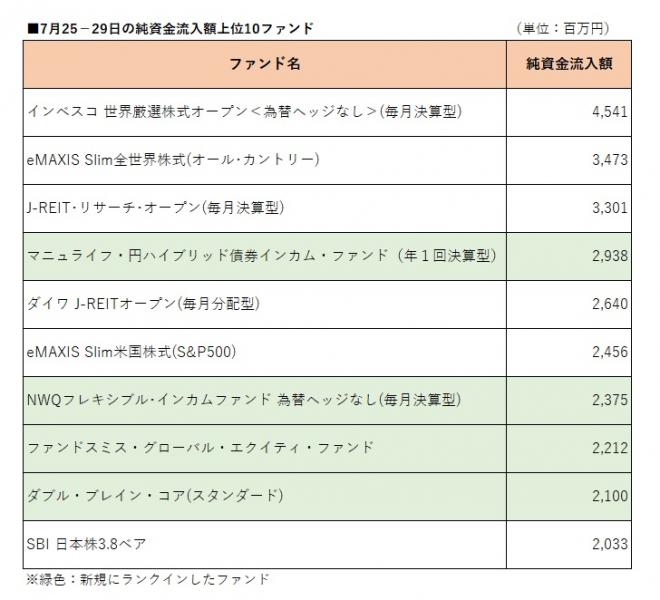 国内公募追加型株式投信(確定拠出年金専用、ファンドラップ専用、及びETF除く)を対象として、ウエルスアドバイザー推計値に基づいて先週(2022年7月25−29日)の純資金流入額上位10ファンドを確認したところ、「インベスコ 世界厳選株式オープン<為替ヘッジなし>(毎月決算型)」(愛称:世界のベスト)が2021年以降で見て初のトップとなった。 「インベスコ 世界厳選株式オープン<為替ヘッジなし>(毎月決算型)」は45億円の純資金流入となり、先々週(2022年7月19−22日)の7位からランクアップした。このほかには、「eMAXIS Slim全世界株式(オール・カントリー)」、「J−REIT・リサーチ・オープン(毎月決算型)」、「ダイワ J−REITオープン(毎月分配型)」、「eMAXIS Slim米国株式(S&P500)」、「SBI 日本株3.8ベア」が先々週に続いてトップ10内となった。 先週新規にトップ10内となったのは、「マニュライフ・円ハイブリッド債券インカム・ファンド(年1回決算型)」、「NWQフレキシブル・インカムファンド 為替ヘッジなし(毎月決算型)」、「ファンドスミス・グローバル・エクイティ・ファンド」、「ダブル・ブレイン・コア(スタンダード)」の4ファンド。「マニュライフ・円ハイブリッド債券インカム・ファンド(年1回決算型)」と「ファンドスミス・グローバル・エクイティ・ファンド」は6月27日−7月1日以来、「ダブル・ブレイン・コア(スタンダード)」は5月2−6日以来のランクイン、「NWQフレキシブル・インカムファンド 為替ヘッジなし(毎月決算型)」は2021年以降で見て初めてのランクインとなった。 一方、先々週ランクインしていたファンドのうち、「楽天・全米株式インデックス・ファンド」(愛称:楽天・バンガード・ファンド(全米株式))、「楽天 日本株3.8倍ベアII」、「SBI・V・S&P500インデックス・ファンド」(愛称:SBI・V・S&P500)、「アライアンス・バーンスタイン・米国成長株投信Dコース毎月決算型(為替ヘッジなし)予想分配金提示型」がトップ10圏外となった。