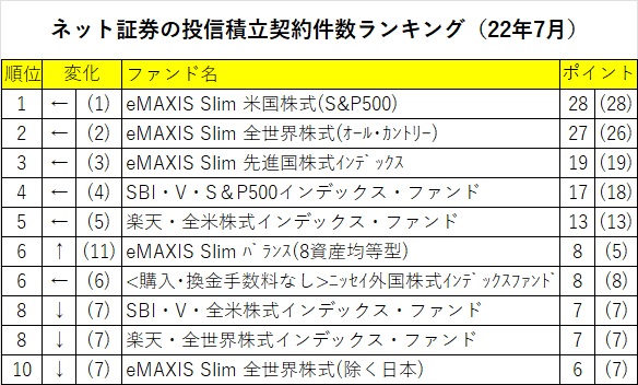 大手ネット証券3社の投信積立契約件数ランキング(月次、22年7月)のトップ3は「eMAXIS Slim 米国株式(S&P500)」、「eMAXIS Slim 全世界株式(オール・カントリー)」、「eMAXIS Slim 先進国株式」で前月と変わらなかった。ランキング上位には「SBI・V・S&P500インデックス・ファンド」や「楽天・全米株式インデックス・ファンド」など、米国株式インデックスファンドが並ぶが、7月はトップ10圏外から「eMAXIS Slim バランス(8資産均等型)」が第6位にジャンプアップした。バランス型がトップ10に入るのは、今年2月に「eMAXIS Slim バランス(8資産均等型)」が第7位に入って以来、5カ月ぶりのこと。 ランキングは、定期的に月次の投信積立契約件数トップ10を公表しているSBI証券、楽天証券、マネックス証券の公開情報を使用。各社ランキング1位に10点、以下、順位が落ちるたびに1点を減点し、第10位を1点として、3社のランキング10位までのファンドの点数を集計した。 投信積立は、毎月定額で長期に資金を積み立てて、時間をかけることで資産を形成する手段になっている。毎月一定金額で投資を継続するため、株式のような値動きが大きな資産が好んで投資対象になっている。定時定額投資を行うと、投資対象の価格が下落した場合は、より多くの口数を購入することができ、将来的にその投資対象が値上がりすると、大きな投資リターンが期待できるためだ。そして、中長期に値上がりが期待される株式として米国株式が選ばれ、そこに手数料を安く投資できる「インデックスファンド」が選択されるようになった。「S&P500」や「NASDAQ100」、あるいは、「全米株式インデックス(CRSP USトータル・マーケット・インデックス)」などが、投信積立契約件数ランキング上位の常連になった。 ところが、今年の米国株式は不振が続いている。年初こそ史上最高値を更新する好調なスタートになったものの、その後は下落基調となり、「S&P500」は高値から20%超、「NASDAQ総合指数」に至っては30%超の下落になった。一般に高値から20%以上下落すると「弱気相場入り」とされ、株価の反転上昇までには相当の時間を要するといわれている。米国は、今年3月から利上げを開始し、7月までに政策金利を合計で2.25%(0.25%+0.50%+0.75%+0.75%)も利上げした。この急速な利上げが、米国の景気の足を引っ張ることになるのではないかという懸念も台頭してきている。米国株価が上昇基調に転換できない要因の1つだ。 「eMAXIS Slim バランス(8資産均等型)」は、世界の主要8資産に分散投資するバランス型ファンドだ。「国内株式」「先進国株式」「新興国株式」「国内債券」「先進国債券」「新興国債券」「国内REIT」「先進国REIT」の8資産に均等に投資する。このため、相対的に米国株式への投資比率が小さくなり、新興国などへの投資比率が大きくなる。2020年から2022年の初頭にかけて先進国株式、中でも、米国株式が大きく上昇し、その間のパフォーマンスが冴えなかった新興国株式や新興国債券に手厚く投資するというのは、現状において一つの考え方といえる。また、8資産にバランスよく投資することによって、今後、米国株が上昇に転じたとしても、その影響も取り込めるという全方位型の戦略になっている。(図版は、ネット証券の投信積立契約ランキング)