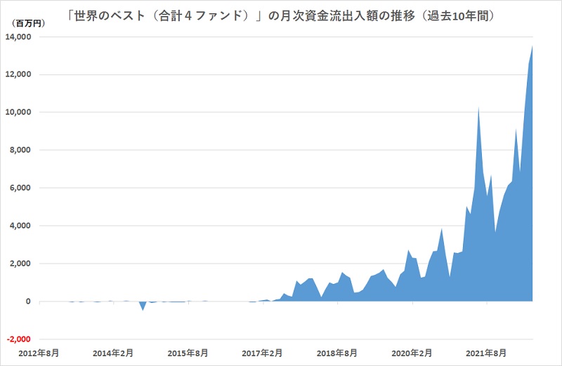 インベスコ・アセット・マネジメントが設定・運用する『世界のベスト』=「インベスコ 世界厳選株式オープン<為替ヘッジあり>(毎月決算型)/<為替ヘッジなし>(毎月決算型)」、「インベスコ 世界厳選株式オープン<為替ヘッジあり>(年1回決算型)/<為替ヘッジなし>(年1回決算型)」に資金流入が加速している。4ファンド合計の月次資金流入は2017年1月以来、22年7月で67カ月連続となり、2022年6月の資金流入額は約126億円と月間純流入額において過去最高を記録し、7月にはそれを更新して約136億円の資金流入額になった(7月は推計値)。純資産残高が約1700億円と4コース中最大で資金流入の中心になっている「<為替ヘッジなし>(毎月決算型)」は、7月の純資金流入額が約133億円と投信業界全体の公募アクティブ型ファンドの中で第1位になった。 「世界のベスト」は、世界中の先進国企業約2万社の株式の中から、成長+配当+割安を追求して“世界のベスト”といえる株式に厳選して投資する世界株式ファンド。設定は現在の「毎月決算型」2本(2016年9月に決算期を毎月に変更)が1999年1月で、20年以上の運用実績がある。その後、「年1回決算型」2本を2018年10月に追加した。投資家の多彩な投資ニーズを満たすように決算の回数と為替ヘッジの有無で、<為替ヘッジあり>(毎月決算型)/<為替ヘッジなし>(毎月決算型)、および、<為替ヘッジあり>(年1回決算型)/<為替ヘッジなし>(年1回決算型)の4つのコースをそろえている。 「<為替ヘッジなし>(毎月決算型)」コースは、22年6月末時点での1年トータルリターンが11.19%で、同ファンドが属するカテゴリー(国際株式・グローバル・含む日本・為替ヘッジなし)の平均マイナス3.25%に対し、優れたリターンを残している。一方、リスク(標準偏差)はカテゴリー平均が18.99%のところ、同ファンドは15.43%と平均を下回り、効率性の高い運用を実現している。 同ファンドの運用は、英国ヘンリーに拠点を置くグローバル・エクイティ・チームが担当している。ヘンリーは学園都市であるオクスフォードに隣接し、欧州金融マーケットの中心地であるロンドンからは距離がある。それだけに、チームのメンバーは、集中して銘柄選定やポートフォリオの構築に取り組むことができる。また、ヘンリーにはマルチアセットの運用チームや債券の運用チームもあり、チーム内だけではなく、チーム間での情報交換や運用についての議論が日常的にできることも、同ファンドの安定的な運用成績に寄与していると考えられる。 同社代表取締役社長兼CEOである佐藤秀樹氏は、「株式市場がボラティリティを高める中でも、20年を超える運用実績と、安定した分配実績や多様なコースをご用意していることが、投資家のニーズを捉え、この結果に結びついたものと考えています。より良いパフォーマンスをご提供できるように努めてまいります」と語っている。世界的にインフレが高進しているものの、地域の金融政策は急速な利上げを実施している国から緩和基調を維持している国まで様々だ。2020年のコロナ・ショック当初のように、世界が一斉に利下げするような局面と違って、各国それぞれに異なる金融政策が実施されるようになると、アクティブ・マネージャーの投資判断が重要な役割を担うようになる。世界的な大手アクティブ・マネージャーとして知られるインベスコの「旗艦ファンド」といえる同ファンドに投資家の関心が高まっているのも、投資環境が不透明で見通し難いからこそ、同社の運用力に期待したいということなのかもしれない。今後のパフォーマンスに注目したい。(グラフは、「世界のベスト」4コース合計の月次純資金流出入額の推移、過去10年間)