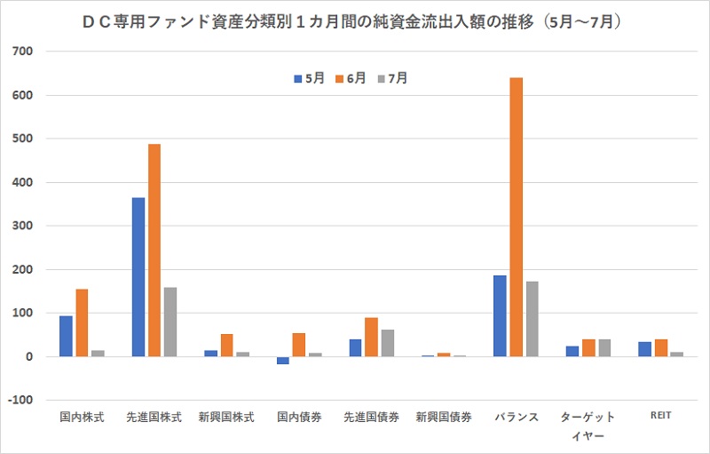 DC専用ファンドの2022年7月の純資金流出入額は約482億円の流入超過となり、資金流入超過は2020年12月以降20カ月連続になった。流入額のトップは前月に続いてバランスで、流入額は約174億円。前月の639億円の3割程度に流入額は減少したが、3月以来5カ月連続の資金流入になった。次いで、先進国株式の約159億円だった。前月同様にすべての資産クラスで資金流入になった。 DC専用ファンド全体の純資産総額は約9兆932億円と前月から約2734億円増加し、初めて9兆円の大台に乗せた。残高の内訳は、株式ファンド47%、債券ファンド16%、バランスファンド35%という割合で、株式ファンドの比率が前月比1%ポイント上昇した。また、バランスファンドに含まれるターゲットイヤー型ファンドの残高が初めて独立したカテゴリーとして1000億円を超えた。ターゲットイヤー型は米国の確定拠出年金で運用の中心になっているカテゴリーの1つとされている。国内でも確定拠出年金制度が広がるにしたがってターゲットイヤー型の利用が徐々に増えている。(※個別のDC規約では、DC専用ファンド以外のファンドを制度に採用している場合があるため、DC専用ファンド全体の純資産総額は、国内DC制度全体で運用されているファンドの残高とは一致しない) ■資金流入額ランキングのトップは「分散投資コア戦略ファンドS」 DC専用ファンドの過去1カ月間の純資金流入額ランキングのトップは、「分散投資コア戦略ファンドS」になった。前月までは外国株式インデックスファンドが資金流入額ランキングの上位を占めたが、7月は、トップに加え、第10位にも「分散投資コア戦略ファンドA」が食い込むなど、バランス型ファンドも見直されてきているようだ。 ただ、流入額トップ10の中心は、依然として外国株式インデックスファンドだ。第2位に「野村 外国株式インデックスF(確定拠出年金)」、第4位に「DIAM 外国株式インデックスF<DC年金>」、第5位に「三井住友・DC外国株式インデックスファンド」が入るなど、トップ10のうち6銘柄が外国株式インデックスファンドになった。 一方、第3位に「フィデリティ・アクティブ・グロース(DC)」が入った。同ファンドは、国内株式を投資対象にしたアクティブファンドだ。米国株式をはじめとして外国株式に上昇一服感が出てきているだけに、出遅れ感が強いとされている国内株式が見直される動きがあるのかもしれない。今後、国内株式への投資意欲が高まっていくのか注目したい。 ■トータルリターンのトップは3カ月連続でピクテの「グロイン」 個別ファンドの過去1年間のトータルリターンランキングトップは、前月トップの「ピクテ・グローバル・インカム株式ファンドDC」が3カ月連続でトップを維持した。第2位も前月同様に「野村 世界好配当株投信(確定拠出年金)」、第3位に「DCダイワ・グローバルREITアクティブF」が浮上した。前月第3位だった「ブラックロック・ヘルスサイエンス・DCファンド」は4位に後退した。 この上位4ファンド以外はすべて先進国REITインデックスファンドだった。(グラフは、過去3カ月間のDC専用ファンド資産分類別資金流出入の状況)