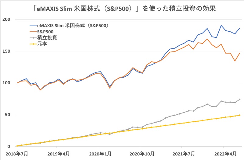 コロナ禍の世界市場をけん引してきた米国の株価が足踏みを続けている。米国の代表的な株価指数である「S&P500」は年初に付けた高値から6月までに20%強も下落して「弱気相場」に入ったといわれる。1946年以来、過去に13回あった「弱気相場」の下では、株価が底を打つまで平均で1年余り、下落率は約33%に達し、以前の高値を回復するまでには底値から約2年が必要というデータがある。株価に上昇が期待できないのであれば、ここは投資を一休みした方が良いという考えになるかもしれないが、このような株価低迷期にこそ資産形成のチャンスがある。次の高値が2〜3年後にやってくるのであれば、その「弱気相場」こそが、10年〜20年投資には格好の仕入れ場になるのではないだろうか? 「S&P500」は、月末ベースでみると2020年3月末の2584.59ポイントから、22年12月末の4766.18ポイントまで、3年弱の期間に84%以上も値上がりした。非常に短い期間に大きく値上がりしたため、ここ数年の間に投資を始めた人は、「こんなに簡単に儲けられるのか!」という気分になったことだろう。20年3月から22年12月までは、ほぼ一本調子で「S&P500」は上昇したため、資産が増えていくのが毎月実感できた。しかし、今年に入ると状況は一変した。経済ニュースでは、米国株価が下落したというニュースが増え、しかも、2月にはロシアがウクライナに侵攻し、原油価格や穀物価格の高騰から米国の中央銀行であるFRBは3月を皮切りに金融政策決定会合が開催されるたびに金利の引き上げを断行し、金利が上がるたびに株価が下押すという展開が続いている。「S&P500」は6月末には、3785.38ポイントに下落し、21年12月末からの下落率は約21%になってしまった。 ただ、ニュースで見聞きする米国株価の下落は、日本の投資家にはニュースが騒ぐほどには大きな影響になっていない。それは、米国株安と同時に進んだ「円安・ドル高」のためだ。たとえば、「S&P500」に連動するインデックスファンドで最大の「eMAXIS Slim 米国株式(S&P500)」の基準価額の動きは、21年12月末のピーク1万9204円に対し、安値を付けたのは22年2月末の1万7684円で、下落率は約8%だ。そして、翌3月末には1万9683円と21年12月末水準を超えた。「S&P500」が落ち込んだ6月末の基準価額は1万8301円で、安値から3.5%上昇した水準にある。そして、7月末には1万9236円になり、21年12月末を超えた水準をキープしている。「eMAXIS Slim 米国株式(S&P500)」に投資していると、今年は「横ばい」が続いている状況だ。 「米国株価は今年20%以上下落し、弱気相場に入った」といわれているほど、日本から米国株式に投資している投資家の資産は傷んでいないのが現実だ。もっとも、急速に進んだ円安が、このまま定着するとは限らない。為替相場が逆転して円高に振れれば、当然ながら、米国株式に投資している投資家には逆風になる。為替変動による評価損益は、その時の運のようなものだ。大切なことは、投資先資産である米国の株価が、将来的に値上がりするかどうかということに尽きる。その点では、米国企業のEPS(1株当たり利益)は、今後も力強く成長する見通しにあり、過去の弱気相場の際に2〜3年先には以前の高値を更新する動きになったことが、今後も期待できるということが安心材料になる。 一方、積立投資で資産形成を行っている人にとって重要なのは、「投資先の下落局面こそが、仕込みのチャンス」ということだ。たとえば、「eMAXIS Slim 米国株式(S&P500)」が設定された2018年7月から、毎月末に1万円ずつの積立投資をしてきたとする。22年7月末までに元本は49万円になっているが、積立投資の評価額は74万円になっている。この間、「S&P500」は約47%上昇し、ファンドの基準価額は約86%上昇している。この価格の上昇分が積立投資の評価額を引き上げた結果だ。しかし、過去の積立投資の評価損益の推移をよく見ると、2020年3月にコロナショックで株価が大きく落ち込むまでは、投資元本と積立投資評価額の間の差異は、ほとんどなかったことがわかる。20年2月末現在で投資元本は20万円で、積立投資評価額は21万円だった。この間、ファンドの基準価額は、投資スタートの18年7月末に対し7%値上がりしていた。 積立投資評価額と投資元本の差異が大きくなるのは、20年3月を越えた後のことだ。大きな下落から1年が経過した21年3月末には、投資元本33万円に対し、評価額は44万円。22年3月末には元本45万円に対し、評価額が71万円になる。時間が経過するほどに、元本と評価額の差異が大きくなっている。このような積立投資評価額の成長には、投資先の価格下落時に積立を継続し、同じ投資金額でも、より多くの口数を購入した積立効果がある。その点では、現在、米国現地の株価が下落する局面で、ファンドの基準価額が円安のために低下しないというのは、積立投資を行っている投資家には不都合なことともいえる。 当面の米国株価の動きを考えると、歴史的に高いインフレ率によってFRBの利上げが継続し、ロシ