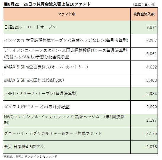 国内公募追加型株式投信(確定拠出年金専用、ファンドラップ専用、及びETF除く)を対象として、ウエルスアドバイザー推計値に基づいて先週(2022年8月22−26日)の純資金流入額上位10ファンドを確認したところ、日興アセットマネジメントの「グローバル・アグリカルチャー&フード株式ファンド」が初めてランクインしたほか、返り咲きなど計5ファンドが新規にランクインした。 「グローバル・アグリカルチャー&フード株式ファンド」は7月29日の設定。実質的に、日本を含む世界の上場企業の中から、農業や食料に関連する事業を行う企業の株式に投資する。実質的な運用は、米ラザード・アセット・マネージメントが担う。 このほかには、「日経225ノーロードオープン」、「J−REIT・リサーチ・オープン(毎月決算型)」、「NWQフレキシブル・インカムファンド 為替ヘッジなし(年1回決算型)」、「楽天 日本株4.3倍ブル」が新規にランクインした。「NWQフレキシブル・インカムファンド 為替ヘッジなし(年1回決算型)」は2021年以降では初のランクイン。「楽天 日本株4.3倍ブル」は6月20−24日以来、「日経225ノーロードオープン」は7月4−8日以来、「J−REIT・リサーチ・オープン(毎月決算型)」は8月8−12日以来のランクインとなった。 また、「日経225ノーロードオープン」は6月13−17日以来約2カ月ぶりのトップとなった。日経平均株価が24日にかけて5日続落するなど先週の国内株式が下落する中で、反転を見込んだ資金が流入したもようだ。「楽天 日本株4.3倍ブル」も同様の動きと見られる。 「インベスコ 世界厳選株式オープン<為替ヘッジなし>(毎月決算型)」(愛称:世界のベスト)、「アライアンス・バーンスタイン・米国成長株投信Dコース毎月決算型(為替ヘッジなし)予想分配金提示型」、「eMAXIS Slim全世界株式(オール・カントリー)」、「eMAXIS Slim米国株式(S&P500)」、「ダイワ J−REITオープン(毎月分配型)」の5ファンドが、先々週(2022年8月15−19日)に続いてランクインした。 一方、先々週トップ10入りしていたファンドのうち、「楽天・全米株式インデックス・ファンド」(愛称:楽天・バンガード・ファンド(全米株式))、「楽天 日本株3.8倍ベアII」、「SBI 日本株3.8ベア」、「SBI・V・S&P500インデックス・ファンド」(愛称:SBI・V・S&P500)、「ダイワ・US−REIT・オープン(毎月決算型)Bコース(為替ヘッジなし)」がトップ10圏外となった。