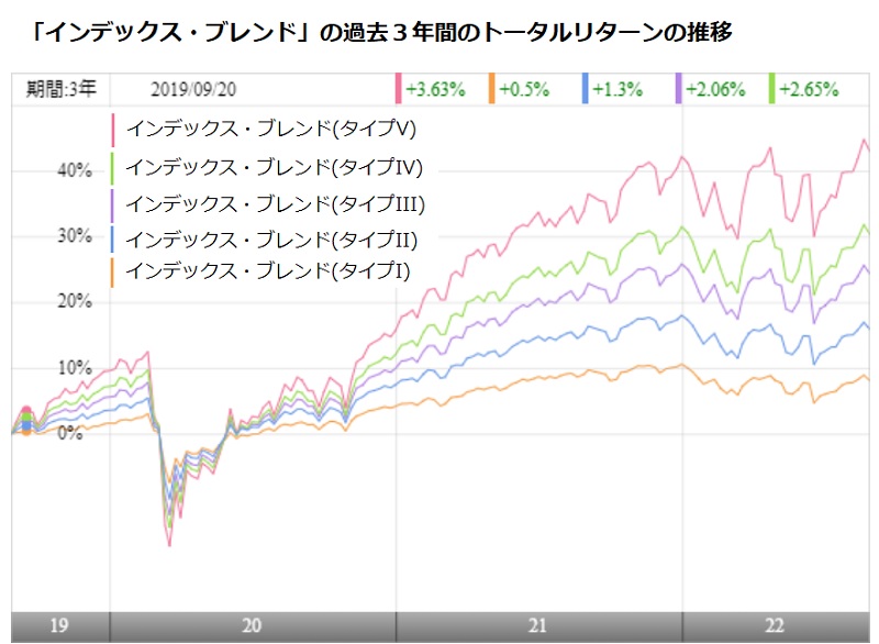 インデックスファンドというと、米国の「S&P500」に代表されるような株価指数に連動するファンドをイメージしがちだが、中には、インデックスファンドを組み合わせた「バランス型」のファンドもある。低コスト、かつ、リスクを抑えた運用商品として注目される。中でも、野村アセットマネジメントが設定・運用する「インデックス・ブレンド(愛称:My Funds−i)」はシリーズ5本のうち4本が、ファンドレーティングで最高格付けの5ツ★を獲得している。低コスト・低リスク、かつ、運用効率にも優れたファンドシリーズとして注目したい。 「My Funds−i」は、新興国を含む国内外の株式や債券、不動産投資信託(REIT)等を実質的な投資対象とし、リスク性資産の投資比率が異なる5つのファンドで構成されている。リスク性資産の投資割合が30%と最も低い「タイプ1」から、同43%の「タイプ2」、55%の「タイプ3」、65%の「タイプ4」、80%の「タイプ5」というラインナップだ。シリーズ5ファンドのうち、4ツ★の「タイプ2」を除く4ファンドがファンドレーティングで最高格付けの「5ツ★」を獲得している(2022年7月末基準)。 シリーズの特徴は、分散投資するファンドが国内株式=「TOPIX(東証株価指数)」、先進国株式=「MSCI−KOKUSAI指数」など、代表的な株価指数に連動するファンドだけでなく、米国で25年以上連続して増配している株式を対象とした「S&P500配当貴族指数」や米ドル建てのハイ・イールド社債を対象としたインデックス「ブルームバーグ米国ハイイールド社債高流動性インデックス」なども対象としていることだ。単純に、国内外の株式・債券・REITを対象にしたバランス型ファンドというだけではなく、各資産の資産構成の内容にまでこだわった分散投資を行っている。この資産の組み合わせについて助言しているのが、野村グループのファンドラップ・サービスの専門会社であるウエルス・スクエアだ。 シリーズの設定は2017年1月なので、5年超の運用実績がある。たとえば、最もリスクが高い「タイプ5」の過去5年(年率)トータルリターンは8.01%になっている。同期間のカテゴリー(バランス)の平均が5.17%だ。また、最もリスクが低い「タイプ1」の5年トータルリターンは2.48%で、カテゴリー(安定)の平均である0.45%を大きく上回っている。信託報酬率(税込み)は、「タイプ1」の0.53%から、「タイプ5」の0.57%まで、0.5%だ。 インデックスファンドの使い方として主流なのは積立投資であり、毎月一定金額を継続的に投資をし続ける積立投資には、比較的価格変動が大きな投資対象の方が向いているという指摘もある。積立途上で株価の暴落などの大きな下落局面があった方が、その下落場面でより多くの口数を購入し続けることによって、将来の価格上昇時により大きな投資収益が獲得しやすくなるという考え方だ。将来の値上がりが確実な資産であれば、積立投資の前半期間の間は大いに下落してくれても良いのだが、リスク性商品の価格が、必ず将来は値上がりするという保証はない。値上がりするとしても、50年先、100年先など、積立投資を予定している期間を超えて遠い将来になるかもしれない。また、単純に今年の米国株価指数のように、短期間で20%〜30%も下落するような動きには耐えられないと感じる投資家もいるだろう。そのような投資家には「My Funds−i」のようなバランス型ファンドがふさわしいといえるだろう。 株式や債券などを幅広く保有する「バランス型ファンド」は、投資先資産のそれぞれの値動きを併せ持つことで、上にも下にも値動きを抑えた運用を実現する。通常は、資産の組み合わせ方法など、専門的な知識を必要とするため、運用コストは高くなりがちだ。そのバランス型を年間0.5%台という低いコストで実現しているのは、投資家にとってうれしいことだ。(グラフは、「インデックス・ブレンド」5ファンドの過去3年間のトータルリターンの推移)