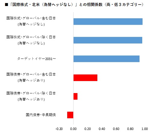 米国株式の先行き不安が高まっている。米国株式ファンドに投資している投資家にとっては、何とも落ち着かない状況にあるが、今後の投資継続を念頭に、分散投資を考えるきっかけとしたい。 NYダウは8月30日時点で昨年末比12.51%、S&P500は同16.37%下落した水準にある。とはいえ、FRB(米連邦準備制度理事会)による金融引締めの長期化観測を背景に米景気減速懸念が深まっており、一段安のリスクがある。「慌てずに回復を待つ」、「積立投資であれば購入口数が増える」とは思っていても、投資先が米国株式一本である場合には、不安が募る。本来ならば、米国株式が上昇している心安らかなときにこそ腰を落ち着けて分散投資によるリスク抑制を考えるのが望ましいのだが、今後も長期にわたって投資を継続するのであれば、先行き懸念が深まっている今考えることにも、意味があろう。 2022年7月までの10年間の月次リターン(2012年8月〜2022年7月)に基づいて、米国株式に投資するファンドからなるウエルスアドバイザーカテゴリー「国際株式・北米(為替ヘッジなし)」と他カテゴリー(ブル・ベア型除く、本数10本未満のカテゴリー除く)との相関係数を調べた。相関係数とは、2つのデータ間の連動性を1〜−1までの範囲で示したもので、1に近いほど連動性が高く、0は無関係、−1に近いほど逆の動きをするとされる。米国株式ファンドとの分散投資効果を考えた場合には、−1に近いカテゴリーに属するファンドが望ましいということになる。 「国際株式・北米(為替ヘッジなし)」との相関係数の低いカテゴリーを3つ見ると、−0.08の「国内債券・中長期債」を始め、0.06の「国際債券・グローバル・除く日本(為替ヘッジあり)」、0.34の「国際債券・グローバル・含む日本(為替ヘッジあり)」となった。国内債券は、足元の10年債利回りが0.2%台と一時に比べると上昇したものの依然として低水準であり、金利低下(債券価格の上昇)余地は小さい。一方、先進国債券の足元の利回りは、米10年債が3%台、ドイツ10年債は1.5%近辺。金利上昇時には価格低下に見舞われたが、特に米国債において、金利低下(債券の価格上昇)の期待が可能な水準にある。 参考までに、カテゴリー「国内大型ブレンド」との相関係数の低い3カテゴリーを見ると、「国内債券・中長期債」が−0.21、「国際債券・グローバル・除く日本(為替ヘッジあり)」が−0.02、「国際債券・グローバル・含む日本(為替ヘッジあり)」が0.21と、「国際株式・北米(為替ヘッジあり)」と同じ顔ぶれとなった。 定石ではあるが、米景気減速懸念から日米株式の先行き不透明感が深まる中で、日本及び先進国の債券に投資するファンドに対する意識が高まりそうだ。