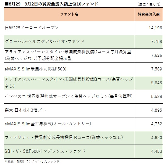 国内公募追加型株式投信(確定拠出年金専用、ファンドラップ専用、及びETF除く)を対象として、ウエルスアドバイザー推計値に基づいて先週(2022年8月29日−9月2日)の純資金流入額上位10ファンドを確認したところ、「日経225ノーロードオープン」が2週連続のトップとなったほか、4ファンドがトップ10内に返り咲いた。 「日経225ノーロードオープン」の純資金流入額は142億円と先々週(2022年8月22−26日)の79億円から増加した。先週の国内株式は続落し、日経平均株価は前週末比▲3.46%となった。金融引締めの長期化による景気減懸念から米国株式が下落した流れが波及した。日経平均株価が下落する中で、同ファンドには、下落一巡後の反転を見込んだ資金が流入したもようだ。 このほかには、「アライアンス・バーンスタイン・米国成長株投信Dコース毎月決算型(為替ヘッジなし)予想分配金提示型」、「eMAXIS Slim米国株式(S&P500)」、「インベスコ 世界厳選株式オープン<為替ヘッジなし>(毎月決算型)」(愛称:世界のベスト)」、「楽天 日本株4.3倍ブル」、「eMAXIS Slim全世界株式(オール・カントリー)」が先々週に続いてトップ10内となった。 先週トップ10内に返り咲いた4ファンドは、「グローバル・ヘルスケア&バイオ・ファンド」(愛称:健次)、「アライアンス・バーンスタイン・米国成長株投信Bコース(為替ヘッジなし)」、「フィデリティ・世界割安成長株投信 Bコース(為替ヘッジなし)」(愛称:テンバガー・ハンター)、「SBI・V・S&P500インデックス・ファンド」(愛称:SBI・V・S&P500)。順に、2021年9月13−17日以来、2022年8月1−5日以来、同7月4−8日以来、同8月15−19日以来のランクインとなった。 一方、先々週トップ10入りしていたファンドのうち、「J−REIT・リサーチ・オープン(毎月決算型)」、「ダイワ J−REITオープン(毎月分配型)」、「NWQフレキシブル・インカムファンド 為替ヘッジなし(年1回決算型)」、「グローバル・アグリカルチャー&フード株式ファンド」がトップ10圏外となった。