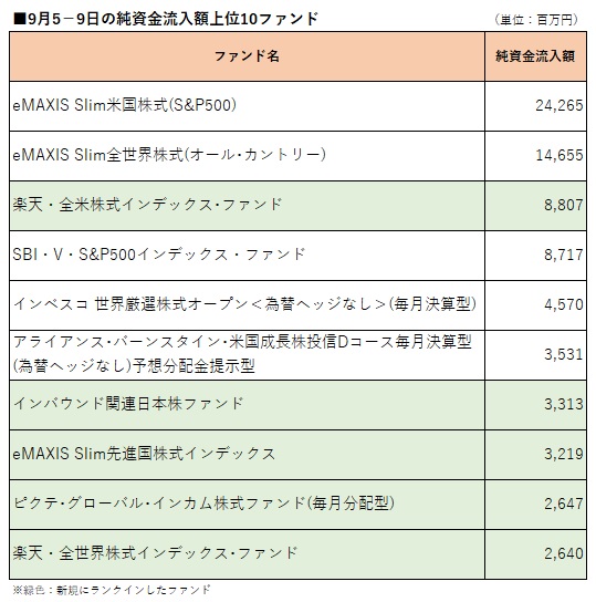 国内公募追加型株式投信(確定拠出年金専用、ファンドラップ専用、及びETF除く)を対象として、ウエルスアドバイザー推計値に基づいて先週(2022年9月5−9日)の純資金流入額上位10ファンドを確認したところ、三井住友トラスト・アセットマネジメントの「インバウンド関連日本株ファンド」(愛称:ビジット・ジャパン)が2021年以降で初のランクインとなったほか、4ファンドがトップ10内に返り咲いた。 「インバウンド関連日本株ファンド」は、インバウンド需要(訪日外国人により生み出される需要)による恩恵が見込まれる国内企業の株式に投資する。インバウンド需要そのものだけではなく、派生需要により収益の増加が見込まれる企業にも幅広く投資する。観光目的の外国人の入国制限が7日から緩和されており、刺激材料となった。7月末時点のポートフォリオを見ると、組入銘柄は68で、組入上位は『三井不動産』(組入比率3.41%)、『西武ホールディングス』(同2.79%)、『寿スピリッツ』(同2.70%)などとなっている。 トップ10内に返り咲いたのは、「楽天・全米株式インデックス・ファンド」(愛称:楽天・バンガード・ファンド(全米株式))、「eMAXIS Slim先進国株式インデックス」、「ピクテ・グローバル・インカム株式ファンド(毎月分配型)」、「楽天・全世界株式インデックス・ファンド」(愛称:楽天・バンガード・ファンド(全世界株式))。順に、8月15−19日以来、8月1−5日以来、7月11−15日以来、8月8−12日以来のランクインとなった。 先週トップとなったのは「eMAXIS Slim米国株式(S&P500)」。243億円の純資金流入となり、先々週(2022年8月29日−9月2日)の4位から順位を上げ、8月8−12日以来のトップとなった。 このほかには、「eMAXIS Slim全世界株式(オール・カントリー)」、「SBI・V・S&P500インデックス・ファンド」(愛称:SBI・V・S&P500)、「インベスコ 世界厳選株式オープン<為替ヘッジなし>(毎月決算型)」(愛称:世界のベスト)、「アライアンス・バーンスタイン・米国成長株投信Dコース毎月決算型(為替ヘッジなし)予想分配金提示型」が先々週に続いてトップ10内となった。 一方、先々週トップ10入りしていたファンドのうち、「日経225ノーロードオープン」、「グローバル・ヘルスケア&バイオ・ファンド」(愛称:健次)、「アライアンス・バーンスタイン・米国成長株投信Bコース(為替ヘッジなし)」、「楽天 日本株4.3倍ブル」、「フィデリティ・世界割安成長株投信 Bコース(為替ヘッジなし)」(愛称:テンバガー・ハンター)がトップ10圏外となった。