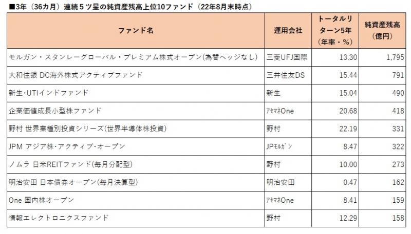 国内アクティブファンド(確定拠出年金専用、ファンドラップ専用、ETF除く)の中で2022年8月末時点までの過去3年間(19年9月末〜22年8月末)にかけてファンドレーティングが連続して5ツ星(★★★★★)であったファンドは20本あった。前月末からは、国内企業が発行する各種債券に投資する1ファンドが加わった。 ウエルスアドバイザーでは毎月上旬に、前月末時点のレーティングを公表している。レーティングは、運用期間3年以上のファンドを対象として、リスク調整後のリターンがその属するウエルスアドバイザーカテゴリー内でどの水準にあるのかを5段階で示したものだ。最上位の5ツ星は、そのファンドが相対的な運用効率に優れていることを示す。 今回新たに到達したのは、アセットマネジメントOneの「One ニッポン債券オープン」。同ファンドは、国内企業が発行する円建て及び外貨建ての各種債券に投資する。債券市場の動向に加え、経営戦略や信用力評価に基づく投資魅力度の高い銘柄を選定する。金利上昇による損失を低減するため、市場環境に応じて債券先物を活用する。2022年8月末時点のポートフォリオの最終利回りは1.98%、債券種類別比率は、円建劣後債45.6%、円建普通社債21.3%、米ドル建劣後債16.8%などとなっている。 同月末時点の過去5年間のトータルリターン(年率)は1.57%とウエルスアドバイザーカテゴリー「国内債券・中長期債」平均を1.92%上回り、カテゴリー109本中トップとなっている。 3年連続5ツ星ファンドのうち同月末時点で純資産残高トップは「モルガン・スタンレーグローバル・プレミアム株式オープン(為替ヘッジなし)」。以下、「大和住銀 DC海外株式アクティブファンド」、「新生・UTIインドファンド」となっている。