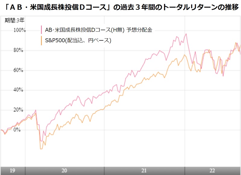 同ファンドのみならず、ファンドの運用会社は、それぞれの運用するファンドの運用状況について、より分かりやすく投資家に伝えるための努力を重ねている。購入時に確認する「目論見書」や「販売用資料」だけでなく、各社が毎月発行する「運用報告書(月報)」や相場の急変時に出す「臨時レポート」など、継続的な情報発信にも注目し、投資しているファンドの理解を深めたい。(グラフは、「AB・米国成長株投信Dコース」の過去3年間のトータルリターンの推移)