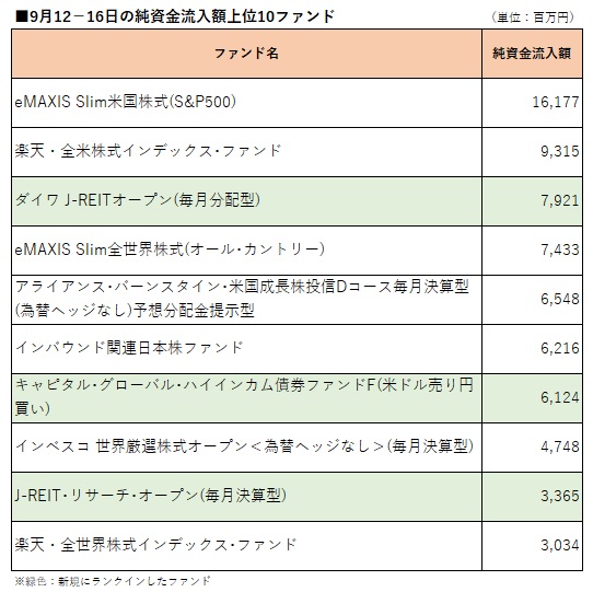 国内公募追加型株式投信(確定拠出年金専用、ファンドラップ専用、及びETF除く)を対象として、ウエルスアドバイザー推計値に基づいて先週(2022年9月12−16日)の純資金流入額上位10ファンドを確認したところ、キャピタル・インターナショナルの「キャピタル・グローバル・ハイインカム債券ファンドF(米ドル売り円買い)」が2021年以降で初のランクインとなったほか、J−REIT2ファンドがトップ10内に返り咲いた。 「キャピタル・グローバル・ハイインカム債券ファンドF(米ドル売り円買い)」は、外国籍ファンドへの投資を通じて、実質的に、世界各国のハイ・インカム債券(非投資適格格付社債及びエマージング債券)に投資する。純資産額とほぼ同額程度の米ドル売り円買いの為替取引を行う。7月末時点のポートフォリオを見ると、平均最終利回りは8.4%、国別構成比率は米国38.4%、メキシコ6.3%、ブラジル4.8%など、証券種別構成比率は社債50.0%、国債39.4%などとなっている。 トップ10内に返り咲いたのは「ダイワ J−REITオープン(毎月分配型)」と「J−REIT・リサーチ・オープン(毎月決算型)」。両ファンドともに8月22−26日以来3週ぶりのランクインとなった。先週の東証REIT指数は前週末比0.27%上昇し、世界の株式が急反落する中で、小幅に続伸した。 先週トップとなったのは「eMAXIS Slim米国株式(S&P500)」。162億円の純資金流入となり、先々週(2022年9月5−9日)に続く2週連続のトップとなった。 このほかには、「楽天・全米株式インデックス・ファンド」(愛称:楽天・バンガード・ファンド(全米株式))、「eMAXIS Slim全世界株式(オール・カントリー)」、「アライアンス・バーンスタイン・米国成長株投信Dコース毎月決算型(為替ヘッジなし)予想分配金提示型」、「インバウンド関連日本株ファンド」(愛称:ビジット・ジャパン)、「インベスコ 世界厳選株式オープン<為替ヘッジなし>(毎月決算型)」(愛称:世界のベスト)、「楽天・全世界株式インデックス・ファンド」(愛称:楽天・バンガード・ファンド(全世界株式))が先々週に続いてトップ10内となった。 一方、先々週トップ10入りしていたファンドのうち、「SBI・V・S&P500インデックス・ファンド」(愛称:SBI・V・S&P500)、「eMAXIS Slim先進国株式インデックス」、「ピクテ・グローバル・インカム株式ファンド(毎月分配型)」がトップ10圏外となった。