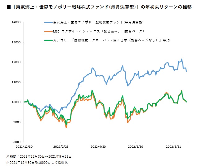 東京海上アセットマネジメントの「東京海上・世界モノポリー戦略株式ファンド(毎月決算型)」は先日、分配金(1万口当たり、税引前)を50円引き上げて150円とした。発表資料によると「これまでの堅調な運用実績に加え、今後の市況動向等を考慮」したという。同ファンドは、インフレの高進を受けて世界的な株安に見舞われている足元において良好な運用成績を残している。「インフレ局面における優位性」が今後、一段とクローズアップされる可能性がある。 同ファンドは、日本を除く世界の株式の中から「モノポリー企業」の株式に投資する。「モノポリー企業」とは、「高い参入障壁等により、一定の地域においてモノ・サービス等を独占・寡占していると判断した企業」であり、発表資料によると、「インフレによるコスト上昇分の価格転嫁が可能で、高い価格決定力を有する」という。2022年8月末時点の組入上位業種を見ると、総合電力27.7%、送配電18.7%、優良道路11.7%などとなっている。なお、実質的な運用は、オーストラリア本拠のマゼラン・アセット・マネジメントが手掛ける。 2022年の年初来リターン(9月21日時点)は15.40%。高い価格競争力を有するモノポリー企業に対する評価の高まりを背景に上昇し、日本を除く先進国の株価推移を示す「MSCIコクサイ・インデックス(配当込み、円換算ベース)」の0.13%、ウエルスアドバイザーカテゴリー「国際株式・グローバル・除く日本(為替ヘッジなし)」平均の▲0.002%を大幅に上回る。参考までに、2022年8月末時点の過去1年間のトータルリターンは24.80%とカテゴリー平均を18.37%上回り、カテゴリー内上位9%(193本中17位)となっている。 現地21日にはFRB(米連邦準備制度理事会)が再度の利上げを決めた。各国で利上げが継続しているが、インフレは抑制できておらず、急ピッチの金融引き締めによる景気悪化懸念が強まっている。高インフレ環境が継続する中で、同ファンドのインフレ耐性や電力などに投資するディフェンシブ性が、投資家の関心を集めることもありそうだ。