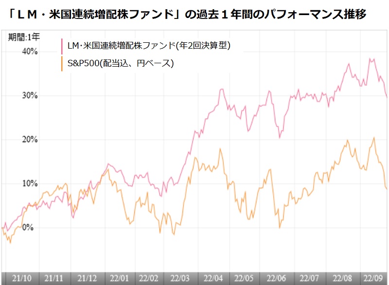 不安定な株式市場が続いている。市場は、世界的なインフレに対し、主要国の中央銀行が急速な利上げに動き、その利上げが長期化する見通しにあることから、今後の景気悪化を懸念している。既に米国の実質GDP成長率は2022年第2四半期(4‐6月)のマイナス成長で2四半期連続のマイナスになっている。ただ、依然として雇用関係の数値が強く、米国では景気後退に入ったとは認識されていないが、2023年には米国が景気後退入りする可能性はかなり高いとみられている。このような景気が弱い時には、どのような経済環境にあっても、しっかりとした業績が確保できる「クオリティの高い銘柄」を選別投資するファンドを選びたい。その1つのヒントが、「LM・米国連続増配株ファンド」に見られるような「連続増配株」にある。 「連続増配株」とは、原則として10年以上にわたって実質的に連続増配している企業をいう。米国には「S&P500配当貴族指数」というインデックスも主要インデックスの1つとして知られている。そして、「S&P500」と「S&P500配当貴族指数」を比較すると、長期でみると「S&P500配当貴族指数」のパフォーマンスが優れた結果を残してきた。たとえば、2000年1月末を100として、2022年3月末までの期間でパフォーマンスを比較すると、「S&P500」が400超のところ、「S&P500配当貴族指数」は1000超と2倍以上の成績になっている。もっとも、過去10年に限ると「S&P500」の22年8月末時点のトータルリターンは年率14.35%で、「S&P500配当貴族指数」の13.02%を上回っているため、連続増配はどんな環境にも通用する万能要素ではない。 「連続増配株」の代表銘柄は、紙おむつの『パンパース』や洗剤の『アリエール』などで知られる「プロクター・アンド・ギャンブル(P&G)」(65年連続増配)、バンドエイドや『リステリン』で知られる「ジョンソン・エンド・ジョンソン」(59年連続)、そして、「コカ・コーラ」(60年連続)などだ。これら企業は、生活で必ず使うような商品において強固なブランド力があり、しかも、市場をグローバルに持っている。増配を重ねることによって、株価も右肩上がりに上昇してきた企業が多い。 「LM・米国連続増配株ファンド(年2回決算型)」の過去1年間のトータルリターンは29.55%。「S&P500(配当込み、円ベース)」の12.70%を大きく上回っている。特に、今年に入ってから「S&P500」を明瞭にアウトパフォームし始めたのは、現在の投資環境にファンドの特性が適っていることを表しているといえるだろう。(グラフは、「LM・連続増配株ファンド(年2回決算型)」の過去1年間のパフィオーマンス推移)