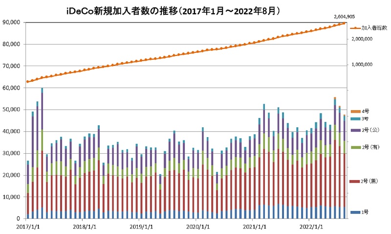 国民年金基金連合会が10月3日に発表したiDeCo(イデコ、個人型確定拠出年金)の業務状況によると8月の新規加入者数は4万7720人で加入者総数は260万4905人になった。新規加入者数は前年同月比8.5%増となり、4カ月連続で前年同月を上回った。なお、従業員のiDeCoに企業が上乗せ拠出をするiDeCo+(中小事業主掛金納付制度)は、実施事業所数は4905事業所、対象従業員数は3万1469人となった。 8月の新規加入者の内訳は、第1号加入者は5419人(前月5432人)、第2号加入者は3万9528人(前月4万3239人)、第3号加入者は2288人(前月2371人)となった。第2号加入者の中では、企業年金なしの新規加入者が2万4579人(前月2万7944人)。共済組合員(公務員)の新規加入者は9179人(前月9170人)となった。 iDeCoの新規加入は、引き続き前年同月比2ケタ手前増の高い水準で伸びている。小麦や缶ビールなど日常的に消費する食品が全国的に値上げされ、この10月1日には飲料・食品だけで6442品目が一斉に値上げされたとニュースが伝えている。今年1年間では値上がりする品目は2万品目を超えるという。ガソリン価格を始め、電力やガスなども単価が高くなってきているため、家計の支出は月額で5000円を超えるような負担増になると試算されている。本来であれば、このようなインフレ(物価上昇)時には、新たな定例支出は抑えて、生活防衛に努めるものだ。iDeCoは60歳までは引き出せない制度になっているため、ここで加入すれば、家計の負担を一段と重くすることにしかならない。にもかかわらず、iDeCoへの加入意欲が衰えず、かつ、1カ月当たりの掛金の金額も継続的に上昇しているのは、長寿社会を迎えた日本において「老後の資金」がかつてなく重要であるという認識が広がっているためと考えられる。 家計支出をみると、2人以上世帯の消費支出は2022年7月現在で28万5313円で、これは、5年前(2017年7月)に対して2.9%増の水準だが、うち、「食料」に対する支出は8万2750円で、5年前比では4.16%増になっている。増加額は3304円だ。食料品の値上げは確実に家計を圧迫していることがわかる。一方、携帯電話料金など通信費については、携帯キャリアから格安プランが出そろって、徐々に家計負担が少なくなる方向にある。「通信」の支出は1万1992円で5年前比7.42%減だ。減額幅は961円なので、この金額でiDeCoの掛金を賄うことはできないが、「電気代」(5年前比16.85%増)、「ガス代」(同12.26%増)などが負担増となっていることを考えると、支出を抑えられる項目があることはありがたい。 このように家計の現状を数値で確認すると、iDeCoの平均掛金である月額1万6197円は、決して小さな支出ではない。ただ、この支出が30年後には累計で583万円となり、これを年率5%で運用できれば30年後には約1326万円をつくることができる。厳しい家計をやりくりして、せっかく老後への備えとしてiDeCoを始めたのであれば、運用利回りがゼロ%の定期預金等の元本確保型商品で運用するのではなく、ぜひ、投資信託を使ったリスク資産で積み立てることを考えていただきたい。苦労して拠出した資金が、30年後に583万円なのか、1326万円なのかの差は大きい。 もちろん、リスク性資産に確定的な利回りなどはなく、今後、必ずプラスになるという保証もない。それだけに、リスク商品での積立に躊躇する気持ちは理解できるが、米国や欧州の国民は、iDeCoと同等の確定拠出年金で株式ファンドを積極的に活用することによって大きな老後資産を実現してきたという事実がある。リスク資産への積立投資は、リスクを軽減し、長期での資産形成を実現する手段として広く推奨されている。iDeCo加入者260万人が、豊かな老後を迎えられることを願ってやまない。(グラフは、iDeCo新規加入者数の推移)