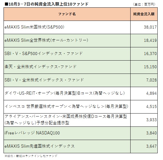国内公募追加型株式投信(確定拠出年金専用、ファンドラップ専用、及びETF除く)を対象として、ウエルスアドバイザー推計値に基づいて先週(2022年10月3−7日)の純資金流入額上位10ファンドを確認したところ、「eMAXIS Slim米国株式(S&P500)」が3週ぶりのトップとなったほか、6ファンドがトップ10内に返り咲いた。 「eMAXIS Slim米国株式(S&P500)」の純資金流入額は380億円。純資金流入額は先々週(2022年9月26−30日)の112億円から大幅に増加した。このほかには、「ダイワ・US−REIT・オープン(毎月決算型)Bコース(為替ヘッジなし)」、「インベスコ 世界厳選株式オープン<為替ヘッジなし>(毎月決算型)」(愛称:世界のベスト)、「アライアンス・バーンスタイン・米国成長株投信Dコース毎月決算型(為替ヘッジなし)予想分配金提示型」が先々週に続いてトップ10入りした。 先週トップ10内に返り咲いたのは、「SBI・V・S&P500インデックス・ファンド」(愛称:SBI・V・S&P500)、「楽天・全米株式インデックス・ファンド」(愛称:楽天・バンガード・ファンド(全米株式))、「SBI・V・全米株式インデックス・ファンド」(愛称:SBI・V・全米株式)の米国株式に投資するインデックス3ファンドと、「eMAXIS Slim全世界株式(オール・カントリー)」、「eMAXIS Slim先進国株式インデックス」、「iFreeレバレッジ NASDAQ100」。トップの「eMAXIS Slim米国株式(S&P500)」を始め、トップ10のうち4ファンドを米国株式インデックスファンドが占めた。 一方、先々週トップ10入りしていたファンドのうち、「日経225ノーロードオープン」、「楽天 日本株4.3倍ブル」、「お金のデザイン・エッセンシャル・プロダクツ・ファンド」(愛称:明日への礎)、「SBI 日本株4.3ブル」、「しんきん インデックスファンド225」、「インデックスファンド225」がトップ10圏外となった。