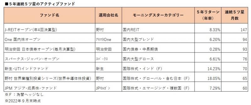 国内公募追加型株式投信(確定拠出年金専用、ファンドラップ専用、ETF除く)のアクティブファンドのうち、2022年9月末時点でファンドレーティングが5年連続(60カ月、2017年10月〜2022年9月)で5ツ星となったファンドは7ファンドある。前月末時点から1ファンドが外れたものの、新たに1ファンドが到達した。 ウエルスアドバイザーでは毎月上旬に、国内公募追加型株式投信を対象に、前月末基準のファンドレーティングを公表している。レーティングは、個々のファンドのリスク調整後リターンが、その属するウエルスアドバイザーカテゴリー内でどの水準にあるのかを5段階で示したもので、5ツ星が最上位となる。 今回新たに5年連続5ツ星に到達したのは、JPモルガン・アセット・マネジメントの「JPM アジア・成長株・ファンド」。同ファンドは、日本を除くアジア各国の企業の株式に投資する。ベンチマーク「MSCI AC アジア・インデックス(除く日本、税引後配当込み、円ベース)」構成国を投資対象国とし、2022年1月末時点では、中国、香港、台湾、韓国、シンガポール、マレーシア、タイ、インドネシア、フィリピン、インドとなっている。投資対象国の企業の中から、収益性、成長性、安定性などを総合的に考慮して銘柄を選択する。 2022年8月末時点のポートフォリオの組入銘柄数は55、国・地域別構成比率上位は中国31.4%、台湾17.6%、インド15.0%、業種別構成比率上位は銀行15.9%、半導体・半導体製造装置12.5%、テクロノジー・ハードウェアおよび機器11.4%。組入上位銘柄(同年7月末時点)は、台湾の『台湾セミコンダクター(TSMC)』9.0%、韓国『サムスン電子』7.6%、中国『テンセント・ホールディングス』5.7%となっている。 その他ファンドの連続5ツ星月数は、「J−REITオープン(年4回決算型)」147カ月、「One 国内株オープン」94カ月、「明治安田 日本債券オープン(毎月決算型)」93カ月などとなっている。