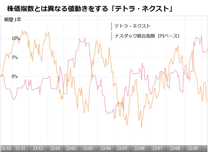 現在のように、長期運用の要となる資産である株式市場が低迷している時は、資産運用にとっては強烈な逆風といえる。積立投資をしていて「株安は数量を多く買えるチャンス」と前向きに捉えられる投資家は、そのままの投資を続けていればよいが、連日の株安に「ニュースを見るのも嫌だ」と感じている人は、この機会に「運用のポートフォリオ」という考え方に立って投資対象資産の見直しをすることも方法だ。運用資産が株式だけに偏っている場合は、債券を組み合わせてみたり、バランス型を取り入れるなど、投資資産の分散を改めて考えてみるようにしたい。運用の仕方は、人ぞれぞれに異なる。どのような市場環境になったとしても運用が継続できることが何よりも重要だ。(図版は、株価指数とは異なる動きをする「テトラ・ネクスト」のパフォーマンス推移)