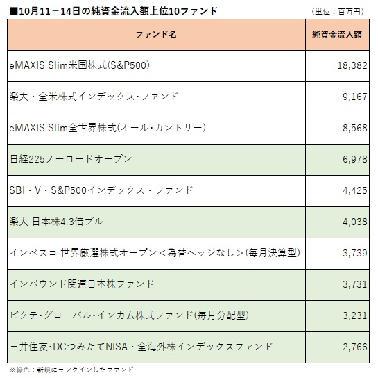国内公募追加型株式投信(確定拠出年金専用、ファンドラップ専用、及びETF除く)を対象として、ウエルスアドバイザー推計値に基づいて先週(2022年10月11−14日)の純資金流入額上位10ファンドを確認したところ、「eMAXIS Slim米国株式(S&P500)」が2週連続のトップとなったほか、5ファンドがトップ10内に返り咲いた。 「eMAXIS Slim米国株式(S&P500)」の純資金流入額は184億円。このほかには、「楽天・全米株式インデックス・ファンド」(愛称:楽天・バンガード・ファンド(全米株式))、「eMAXIS Slim全世界株式(オール・カントリー)」、「SBI・V・S&P500インデックス・ファンド」(愛称:SBI・V・S&P500)、「インベスコ 世界厳選株式オープン<為替ヘッジなし>(毎月決算型)」(愛称:世界のベスト)が先々週(2022年10月3−7日)に続いてトップ10入りした。 先週トップ10内に返り咲いたのは、「日経225ノーロードオープン」、「楽天 日本株4.3倍ブル」、「インバウンド関連日本株ファンド」(愛称:ビジット・ジャパン)、「ピクテ・グローバル・インカム株式ファンド(毎月分配型)」、「三井住友・DCつみたてNISA・全海外株インデックスファンド」。「日経225ノーロードオープン」と「楽天 日本株4.3倍ブル」は9月26−30日以来2週ぶり、「インバウンド関連日本株ファンド」は9月20−22日以来3週ぶり、「ピクテ・グローバル・インカム株式ファンド(毎月分配型)」は9月5−9日以来5週ぶり、「三井住友・DCつみたてNISA・全海外株インデックスファンド」は7月11−15日以来3カ月振りのランクインとなった。 一方、先々週トップ10入りしていたファンドのうち、「SBI・V・全米株式インデックス・ファンド」(愛称:SBI・V・全米株式)、「ダイワ・US−REIT・オープン(毎月決算型)Bコース(為替ヘッジなし)」、「アライアンス・バーンスタイン・米国成長株投信Dコース毎月決算型(為替ヘッジなし)予想分配金提示型」、「iFreeレバレッジ NASDAQ100」、「eMAXIS Slim先進国株式インデックス」がトップ10圏外となった。