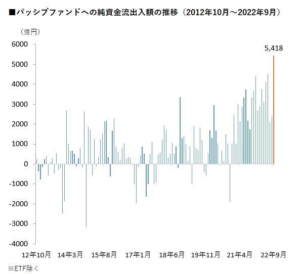 2022年9月の国内公募追加型株式投信(ETF除く)への資金フローをアクティブ、パッシブファンド別に見たところ、パッシブファンドへの純資金流入額が過去10年間で最大となった。同月は各国の相次ぐ利上げを受けて世界的な株安・債券安に見舞われたが、金融市場が混乱する中でも、パッシブファンドへの資金流入は増加し、アクティブファンドに対する優位が継続した。 同月のパッシブファンドへの純資金流入額(個別ファンドの合計)は5418億円となった。純資金流入は22カ月連続で、純資金流入額は2022年6月の4502億円を上回って過去10年間(120カ月、2012年10月〜2022年9月)で最大となった。同月はアクティブファンドも3210億円の純資金流入となり純資金流入額は前月比63.8%増となったが、パッシブの前月比伸び率は124.8%(約2.5倍)と大きく上回った。2022年9月までの純資金流入額の合計もアクティブの2兆8167億円に対して、パッシブは3兆938億円と上回る。米国を始めとした各国の金融引締め、ロシアのウクライナ侵攻の長期化、中国の景気減速懸念などを受けて2022年は金融市場の動揺が続いているが、その中にあってパッシブの優位が継続している。 同月の資金フローを個別ファンドごとに見ると、純資金流入額トップは「eMAXIS Slim米国株式(S&P500)」で615億円の純資金流入となった。同ファンドを始め、「eMAXIS Slim全世界株式(オール・カントリー)」、「楽天・全米株式インデックス・ファンド」(愛称:楽天・バンガード・ファンド(全米株式))、「SBI・V・S&P500インデックス・ファンド」(愛称:SBI・V・S&P500)と、つみたてNISA採用の米国もしくは全世界の株式に投資するパッシブファンドが純資金流入額上位を占めた。いずれも前月から純資金流入額が増加しており、市場動向にかかわらず安定した資金流入が続いている。また、日経225連動型の「日経225ノーロードオープン」が383億円の純資金流入で第2位に入った。日本株が下落する中で、戻りを見込んだ資金が流入し、100億円の純資金流出となった前月から流入超過に転じた。