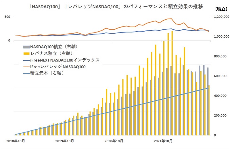 9月の月間リターンランキングは、「NASDAQ100 3倍ベア」をトップに、「株式ベア型」でレバレッジ(テコの原理)を使ったファンドが上位を席巻した。このような「ブルベア型」のファンドは、主としてタイミングを見計らって投資する手段として使われ、長期の資産形成には不向きだとみなされていた。しかし、積立投資の普及に伴って、ブル型ファンドを使った積立投資を行う投資家も増えてきた。中でも、投資家の支持を集めたのは、米国の先端企業が多く上場するNASDAQ市場の代表銘柄で構成された株価指数「NASDAQ100」を使ったレバレッジ運用だ。通称で「レバナス」という言葉が使われるほど、一部の投資家に愛用されるようになった。ただ、9月のように、「ベア型」でプラスのパフォーマンスが出る時には、「ブル型」は大きなマイナスパフォーマンスになっている。「レバナス」の積立投資の現状を検証してみた。 「NASDAQ100」は、米国の新興企業向けの株式市場「NASDAQ」に上場する時価総額上位100銘柄(金融を除く)の時価総額加重平均で算出される株価指数だ。構成銘柄は、GAFAM(グーグル<持ち株会社アルファベット>、アマゾン、フェイスブック<現メタ・プラットフォームズ>、アップル、マイクロソフト)をはじめ、テスラ、エヌビディア、アドビ、ネットフリックスなど、米国を代表するテクノロジー企業を幅広くカバーしている。ここ数年、「NASDAQ100」や「NASDAQ100」のレバレッジ型ファンドが注目を集めたのは、2020年3月の「コロナ・ショック」以降に、GAFAMを中心とした米国のテクノロジー企業の株価が大きく値上がりしたためと考えられる。 「NASDAQ100」に連動するインデックスファンドとして運用期間も長く、残高も大きなファンドとして2018年8月設定の「iFreeNEXT NASDAQ100インデックス」がある。そして、レバレッジ2倍の「iFreeレバレッジNASDAQ100」は、2018年10月設定で、いわゆる「レバナス」の代表銘柄の1つだ。これらファンドの2020年3月から2021年12月までの値上がりはすさまじく、「iFreeNEXT NASDAQ100インデックス」は月末比較でプラス121%(約2.2倍)、「iFreeレバレッジNASDAQ100」はプラス296%(約3.9倍)になっている。 これらファンドを「iFreeレバレッジNASDAQ100」が設定された2018年10月から、毎月末に1万円ずつの積立投資を実行していたら、2021年12月末時点で投資元本39万円に対し、「iFreeNEXT NASDAQ100インデックス」の積立投資の評価額は70万1312円、「iFreeレバレッジNASDAQ100」では105万6121円に膨れ上がったことになる。「レバナス」を使った積立投資は、積立開始から3年3カ月で投資元本の2.7倍に増えたことになる。「レバナス」での積立投資に投資家が熱狂したのは、至極当然のことといえよう。 しかし、急速に値上がりしたファンドの基準価額は、下落する場合のスピードも速い。ともに、2021年12月をピークに2ファンドとも下げ足を速めた。「iFreeNEXT NASDAQ100インデックス」の基準価額は21年12月末が2万2450円だったが、22年6月末には1万8879円に下落。6カ月間で約16%の下落率となった。「iFreeレバレッジNASDAQ100」は、21年12月末の4万2484円が22年9月末には1万7735円だ。9カ月間で58%以上の下落率になった。半値以下に落ち込んだことになる。この大きな価格の落ち込みは、積立投資の評価額にも直接的な影響を与え、22年9月末現在には「iFreeレバレッジNASDAQ100」の積立投資の評価額は50万5967円となり、積立元本の48万円とほぼ同じ額になってしまった。一時期は元本の2.7倍に膨れ上がった評価益を吐き出したかっこうだ。 レバレッジ型ファンドの価格変動の大きさは、この4年間の「iFreeレバレッジNASDAQ100」の動きだけを見ても良くわかる。積立投資は、投資タイミングを分散することによって価格変動リスクを抑制する効果があるといわれるが、さすがに、1年足らずで半値以下になってしまうような急落は吸収できず、資産価値の大幅な目減りになってしまった。積立投資は、投資対象が下落し続けている局面では、資産価値を保全できない。積立投資で成功するには最終的には価格が上がっていく局面が必要になる。今のところは、「NASDAQ100」が下げ止まったというわけではなく、来年以降に米国の景気後退が懸念されていることから、一段と下落することもあり得るという状況だ。 このため、「レバナス」積立を行っている投資家は、ここから数カ月、もしくは、1〜2年、または、それ以上の期間は厳しい環境が続くと覚悟しなけらばならないだろう。「NASDAQ100」の復活をひたすら待ち続ける覚悟が必要になる。レバレッジ型のファンドを使った積立投資は、上昇時の見返りも大きいことと同時に、下落時の辛抱もきついものになる。 ただ、下落時の積立口数は着実に積み上がっている。たとえば、「iFreeレバレッジNASDAQ100」の基準価額がピークを付けた21年12月末に1万円を基準価額で割ると約0.24だったが、21年9月末には約0.56と約2倍になっている。今後、基準価額が下落すれば、同じ1万円で購入可能な口数が増えることになる。耐えて貯え