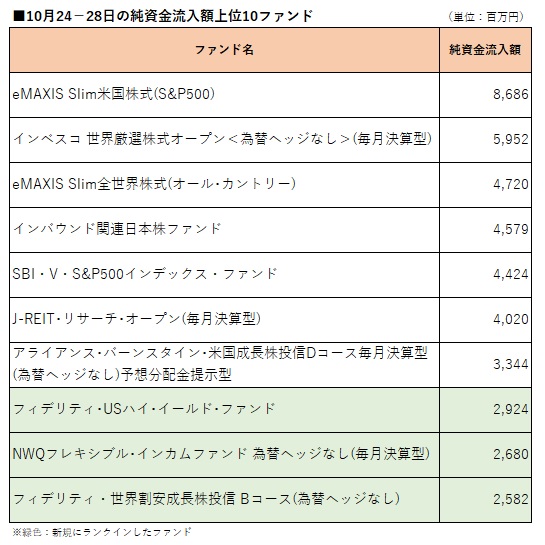 国内公募追加型株式投信(確定拠出年金専用、ファンドラップ専用、及びETF除く)を対象として、ウエルスアドバイザー推計値に基づいて先週(2022年10月24−28日)の純資金流入額上位10ファンドを確認したところ、「eMAXIS Slim米国株式(S&P500)」が4週連続のトップとなった。先々週(2022年10月17−21日)から3ファンドが入れ替わった。 「eMAXIS Slim米国株式(S&P500)」のほかには、「インベスコ 世界厳選株式オープン<為替ヘッジなし>(毎月決算型)」(愛称:世界のベスト)、「eMAXIS Slim全世界株式(オール・カントリー)」、「インバウンド関連日本株ファンド」(愛称:ビジット・ジャパン)、「SBI・V・S&P500インデックス・ファンド」(愛称:SBI・V・S&P500)、「J−REIT・リサーチ・オープン(毎月決算型)」、「アライアンス・バーンスタイン・米国成長株投信Dコース毎月決算型(為替ヘッジなし)予想分配金提示型」が先々週に続いてトップ10入りした。 先週新たにトップ10入りした3ファンドは、「フィデリティ・USハイ・イールド・ファンド」、「NWQフレキシブル・インカムファンド 為替ヘッジなし(毎月決算型)」、「フィデリティ・世界割安成長株投信 Bコース(為替ヘッジなし)」(愛称:テンバガー・ハンター)。「フィデリティ・USハイ・イールド・ファンド」は2021年以降では初めて、「NWQフレキシブル・インカムファンド 為替ヘッジなし(毎月決算型)」は7月25−29日以来3カ月ぶり、「フィデリティ・世界割安成長株投信 Bコース(為替ヘッジなし)」は8月29−9月2日以来約2カ月ぶりのランクインとなった。 一方、先々週トップ10入りしていたファンドのうち、「楽天・全米株式インデックス・ファンド」(愛称:楽天・バンガード・ファンド(全米株式))、「ダイワ・US−REIT・オープン(毎月決算型)Bコース(為替ヘッジなし)」、「たわらノーロード先進国株式」がトップ10圏外となった。
