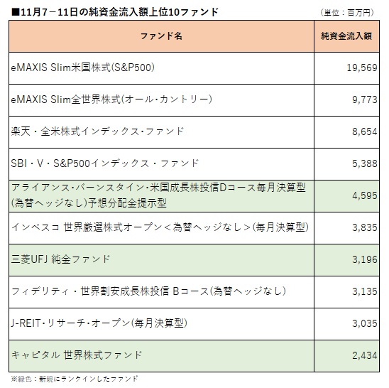 国内公募追加型株式投信(確定拠出年金専用、ファンドラップ専用、及びETF除く)を対象として、ウエルスアドバイザー推計値に基づいて先週(2022年11月7−11日)の純資金流入額上位10ファンドを確認したところ、「eMAXIS Slim米国株式(S&P500)」が6週連続のトップとなり、3ファンドが新たにトップ10入りした。 「eMAXIS Slim米国株式(S&P500)」の純資金流入額は196億円。このほかには、「eMAXIS Slim全世界株式(オール・カントリー)」、「楽天・全米株式インデックス・ファンド」(楽天・バンガード・ファンド(全米株式))、「SBI・V・S&P500インデックス・ファンド」(愛称:SBI・V・S&P500)、「インベスコ 世界厳選株式オープン<為替ヘッジなし>(毎月決算型)」(愛称:世界のベスト)、「フィデリティ・世界割安成長株投信 Bコース(為替ヘッジなし)」(愛称:テンバガー・ハンター)、「J−REIT・リサーチ・オープン(毎月決算型)」が先々週(2022年10月31−11月4日)に続いてトップ10入りした。 先週新たにトップ10入りした3ファンドは「アライアンス・バーンスタイン・米国成長株投信Dコース毎月決算型(為替ヘッジなし)予想分配金提示型」、「三菱UFJ 純金ファンド」(愛称:ファインゴールド)、「キャピタル 世界株式ファンド」。「アライアンス・バーンスタイン・米国成長株投信Dコース毎月決算型(為替ヘッジなし)予想分配金提示型」は10月24−28日以来、「キャピタル 世界株式ファンド」は8月1−5日以来のランクイン。「三菱UFJ 純金ファンド」は2021年以降で初めてのランクインとなった。なお、先週の海外株式は米国の利上げペース減速への期待感から概ね反発し、米S&P500は前週末比5.90%上昇した。為替相場ではドル・円相場が前週末比4%強のドル安・円高となった。 一方、先々週トップ10入りしていたファンドのうち、「米国NASDAQオープンAコース」、「アライアンス・バーンスタイン・米国成長株投信Bコース(為替ヘッジなし)」、「インバウンド関連日本株ファンド」(愛称:ビジット・ジャパン)がトップ10圏外となった。