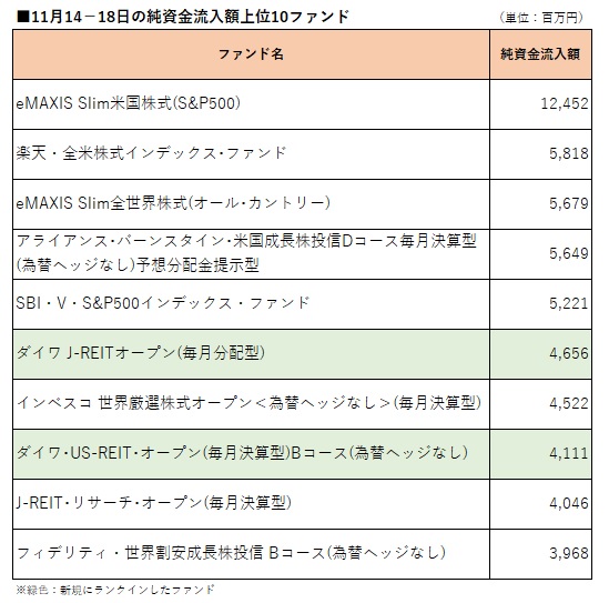 国内公募追加型株式投信(確定拠出年金専用、ファンドラップ専用、及びETF除く)を対象として、ウエルスアドバイザー推計値に基づいて先週(2022年11月14−18日)の純資金流入額上位10ファンドを確認したところ、「eMAXIS Slim米国株式(S&P500)」が7週連続のトップとなり、REIT2ファンドがトップ10内に返り咲いた。 「eMAXIS Slim米国株式(S&P500)」の純資金流入額は125億円。このほかには、「楽天・全米株式インデックス・ファンド」(楽天・バンガード・ファンド(全米株式))、「eMAXIS Slim全世界株式(オール・カントリー)」、「アライアンス・バーンスタイン・米国成長株投信Dコース毎月決算型(為替ヘッジなし)予想分配金提示型」、「SBI・V・S&P500インデックス・ファンド」(愛称:SBI・V・S&P500)、「インベスコ 世界厳選株式オープン<為替ヘッジなし>(毎月決算型)」(愛称:世界のベスト)、「J−REIT・リサーチ・オープン(毎月決算型)」、「フィデリティ・世界割安成長株投信 Bコース(為替ヘッジなし)」(愛称:テンバガー・ハンター)が先々週(2022年11月7−11日)に続いてトップ10入りした。 先週新たにトップ10入りした2ファンドは「ダイワ J−REITオープン(毎月分配型)」と「ダイワ・US−REIT・オープン(毎月決算型)Bコース(為替ヘッジなし)」。「ダイワ J−REITオープン(毎月分配型)」は9月12−16日以来2カ月ぶり、「ダイワ・US−REIT・オープン(毎月決算型)Bコース(為替ヘッジなし)」は10月17−21日以来約1カ月ぶりのランクインとなった。 一方、先々週トップ10入りしていたファンドのうち、「三菱UFJ 純金ファンド」(愛称:ファインゴールド)、「キャピタル 世界株式ファンド」がトップ10圏外となった。
