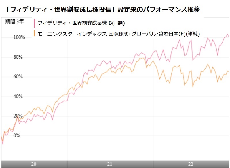 米国の急速な利上げによって2023年の米国経済は減速し、マイナス成長の景気後退に陥るのではないかという懸念が強まっている。このような景気の先行きが不透明な時にでも株式投資で着実な投資収益を稼いでいける方法として注目されるのが「割安株(バリュー株)投資」だ。景気が良くて市場全体に上昇の勢いがある場合は、企業の成長性に着目した「成長株(グロース株)投資」の高い収益率に目を奪われるが、成長株の上昇勢いが衰えた時に割安株投資の魅力が浮き彫りになってくる。米国を代表する割安株投資のファンド「フィデリティ・世界割安成長株投信(愛称:テンバガー・ハンダー)」の人気が盛り上がってきたのは、来年以降の低成長を見据えた動きなのかもしれない。同ファンドは2020年3月の設定以来、2022年10月まで32カ月連続で月次ベースの資金流入が継続している。 「テンバガー・ハンター」は、市場が気づいていない成長機会を持つ割安な銘柄である「割安成長株」を世界の市場から発掘することを目指している。愛称の「テンバガー・ハンター」の「テンバガー」は株価が10倍になるような「大化け株」のことを指す。優れた経営者、強固な財務基盤、独自の商品・サービスによる強い競争力など、企業としてのクオリティ(品質)が高い企業について、割安な株価水準で投資する。したがって、2020年の「コロナ・ショック」の後にあった「デジタル・トランスフォーメーション」を切り口としたIT成長株の大きな上昇波のような市場環境は、同ファンドは苦手とする環境といえるが、その中にあってもしっかりと着実な収益を重ねてきた。そして、いよいよ米国が利上げに転換する姿勢を明確にして2022年に入ってから大幅に値上がりしていたIT銘柄の株価の下落が始まったが、その下落に連れて基準価額の水準を落とすことなく、しっかり踏みとどまってパフォーマンスを維持することができている。 同ファンドのポートフォリオでは、世界株式(MSCIワールド・インデックス)と比較してIT(情報技術)の銘柄への投資比率が低く、地域別にはアメリカへの配分比率は低く、日本への配分が多くなっている。「デジタル・トランスフォーメーション」への期待で何年も先の利益まで株価が織り込んでしまって割高になったIT銘柄を買わずに、万年割安といわれている日本株の中に投資機会を見出している。この将来の成長期待が強い銘柄を探し出すには、フィデリティが世界の運用拠点で続けている地道なリサーチ活動の成果を使っている。フィデリティの他のファンドと異なる特徴は、「割高な銘柄には一切手を出さない」という姿勢の徹底だ。 同ファンド(Bコース、為替ヘッジなし)の過去1年間のトータルリターンは2022年10月末現在で12.58%。日本を含むグローバル株式(為替ヘッジなし)というカテゴリーの平均がマイナス3.83%になる中で、際立った運用成績になった。ちなみに、この1年間のトータルリターンは米国の「S&P500(配当込み、円ベース)」は大幅な円安の影響等もあって12.44%になったが、その水準をも上回っている。そして、設定来のトータルリターンは10月末現在で137.40%と、当初1万円の基準価額が2年7カ月で2万3740円と2.37倍になっている。 さらに、同ファンドと同じ運用を行う米国籍ファンドの過去20年余りの運用実績を振り返ると、米国が利上げを実施している局面でもしっかりした運用成績を残していることがわかる。たとえば、「ITバブル」といわれた2000年の好況期に1999年5月から2000年12月まで米政策金利が4.75%から6.50%に引き上げられた時、同運用戦略は21.8%の上昇になった。また、ITバブル崩壊を克服し「リーマン・ショック」の大幅下落になるまでの2004年5月から2007年8月までに米政策金利は1.00%から5.25%に引き上げられたが、この間も56.3%上昇した。さらに、前回の利上げ時の2015年11月から2019年7月まで0.25%から2.50%に引き上げられた時にも28.9%のプラス成長を実現している。現在、2022年3月のゼロ%金利から始まった利上げは11月までに4%の水準にまで引き上げられ、2023年3月ごろまでは利上げが続くと見通されている。この急速な利上げが米国経済の腰を折ると懸念されているが、同ファンドのパフォーマンスを見る限りは、利上げが実施されている局面においては、堅調なパフォーマンスが期待できる。 過去の米国経済は、大幅に政策金利を引き上げた後で、リセッション(景気後退)を経験しなかったことがない。要は、その景気後退の落ち込み度合いがどうなるかだ。「リーマン・ショック」のように回復まで数年を要する深い落ち込みになるか、軽微な落ち込みで次の成長ステージにすすめるのか。それはその時を迎えてみないとわからない。ただ、景気が落ち込むことになるのであれば、「テンバガー・ハンター」のように割安な水準で投資するファンドに安心感がある。景気後退期の落ち込みが小さければ、その後の景気回復で得られるリターンもしっかり取り込めるというものだ。(グラフは「テン
