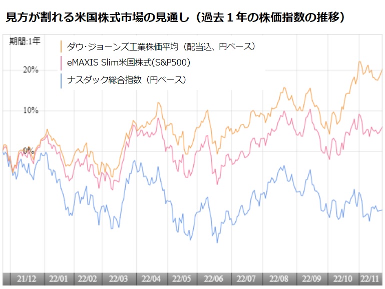 米国の政策金利は、2022年3月に0.25%引き上げられてから11月までにFOMC(連邦公開市場委員会)が開催されるたびに6会合連続で引き上げられた。6月以降は利上げ幅が0.75%と拡大され、4会合連続で0.75%の利上げが実施された。11月24日に公開された11月会合の議事要旨では、大多数の参加者が「近いうちに利上げペースを減速することが適当」と主張したことが明らかになり、12月のFOMCでは0.5%の利上げとの見通しが一段と強まった。年末も接近し、今後の投資戦略を考える上で、米国経済や米国株式の行方をどのように考えればよいのだろうか? 米国経済の行方を考える上で、米国の長期債市場の動きが1つの示唆になる。米10年国債利回りは、10月24日に4.24%という水準に上昇した後に低下し、11月23日には3.69%になった。米国の政策金利(超短期金利の指標であるFFレート)は11月の利上げの結果、3.75%〜4.00%の水準に引き上げられており、短期金利の水準に対して長期金利の利回りが低い「逆イールド」の状況になっている。短期金利は政策としてFRBの意図によって高い水準に持ち上げられているが、多くの参加者が入る市場金利は政策当局者が意図する金利水準には米国経済が耐えられないと見ているということだ。政策当局としては、現在の高すぎるインフレ率を正常化するため、利上げを継続しているが、債券市場の参加者は4%を超える金利の水準には米国経済が耐えきれず、将来の金利低下や利下げを先読みしているということになっている。 10年国債利回りの推移は、6月14日に3.47%の高い水準を付けた後、8月1日には2.58%まで低下した。その後、10月24日に4.24%を付けるまで上昇していく。この間、7月の政策金利決定会合で政策金利は2.25%〜2.50%への利上げが決定され、9月の政策決定会合で3.00%〜3.25%に再利上げ、11月にもさらに0.75%の利上げが実施された。市場の金利水準には波があるが、12月のFOMCで0.5%の利上げが実施されれば、政策金利は4.25%〜4.50%という水準になる。それを控えて10年債の利回りが3.69%に低下しているのは、市場の見方としては、12月のFOMCで0.5%以上の利上げが実施されると、米国経済に重い影響を与えそうだという懸念を示しているように見える。 このような市場の見方を反映して、2023年の米国株式市場には期待が持てないという見方が強まっている。少なくとも、前年までの米国株式市場をリードしたハイテク銘柄を中心としたGAFAM(グーグル、アマゾン、フェイスブック、アップル、マイクロソフト)などの大型成長株(グロース株)には期待が持てないという見方が強い。グロース株を見切って、投資対象をバリュー株に転換すべきだという主張は比較的強い。 一方、年初からの株安で、最も大きく下落したのはGAFAMなどのハイテク大型株だ。グーグル(持ち株会社:アルファベット)の株価は年初145ドルだったものが90ドル割れ(年初からの下落率は38%)、アマゾンは170ドルから90ドル割れ(同47%)、フェイスブック(メタ・プラットフォームズ)は340ドルが90ドル(同74%)、アップルは180ドルが130ドル台(同28%)、マイクロソフトは330ドルが210ドル台(同36%)、それぞれ年初から大きく下落した。これだけ下落した後のだから、来年は株価の持ち直しが期待できるという見方もある。 米運用会社のナティクシス・インベストメント・マネージャーズ・ソリューションズのポートフォリオ・ストラテジストのギャレット・メルソン氏は、11月に発行したレポートで「成長株は、将来的に回復するものと思われる。軟着陸のシナリオが現実になれば、リスク回避のため、最も売り込まれたハイテク株が買われる可能性が高い」と見通している。あまりにも大きく下落したハイテク成長株には、リバウンドが期待できるという見方だ。そして、「長期的には、コロナ後の世界は、成長率の鈍化、インフレ率の低下、そして、最終的には金利の低下という、コロナ前に近い環境へと正常化するため、成長株が再び市場をリードすると予想されるが、その旗振り役は、過去10年間をリードした企業とは異なる可能性が非常に高いだろう」と展望している。 このように市場の見方が分かれるのは、米国の利上げの行方が見通せず、かつ、この利上げの影響が米国経済にどのような影響を与えるのかが明確ではないためだ。はっきりしているのは、「リーマン・ショック」(2008年)への対応として始まった大規模な量的金融緩和は縮小に向かうということだろう。各国の金融当局が「正常化」を望んでいる。株式も債券も流動性の高い資産に資金がジャブジャブと注ぎ込まれて、良いもの悪いものの区別なく等しく上昇するような市場は、徐々に収束に向かうということだ。「インデックスこそが最高の投資手段だ」というような状況ではなくなるだろう。何が良くて、何が悪いのかの見極めが重要となり、資産を価格変動リスクから避けるためには「分散」が必要だと実感させられることになるだろう。米国株式市場の見方1つとっても、方向性の異なる意見が様々に出