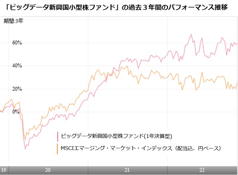 「ビッグデータ新興国小型株ファンド(1年決算型)」が堅調なパフォーマンスを刻んでいる。2022年10月末現在で3年(年率)トータルリターンが15.28%となり、複数の新興国に投資する株式ファンド152本中で第4位にランクされている。1年トータルリターンも6.41%と、カテゴリー平均がマイナス10.15%に沈む中で堅調な運用成績になった。10月末時点で設定から3年間が経過し、初めてファンドレーティングの対象ファンドになったが、スタート時点での格付けは5ツ星と好成績になった。同ファンドは、10月末現在で投資銘柄は330銘柄と幅広い銘柄に分散投資している。新興国にあってこれから成長を遂げていきそうな小型株に広く投資するアクティブファンドとして注目したい。 同ファンドは、ファンド名に「ビッグデータ」と入っていることから、ビッグデータ関連のハイテク株に主として投資するファンドという印象を持ってしまうが、この「ビッグデータ」は銘柄発掘の手段としてビッグデータを活用することを意味している。新興国市場を幅広くカバーしてアナリストを配置して調査することは現実的ではないため、世界各地の様々なデータをビッグデータとして収集・分析することで、有望銘柄を発掘することに役立てる。ビッグデータを活用した計量モデル運用に強みを持つアクサ・インベストメント・マネージャーズが実質的な運用を行っている。 同ファンドでは、銘柄ごとに数百項目に上るデータを収集し、蓄積している。業績や資産などの各種財務データ、ESGスコアなどの「企業ファンダメンタルズ・データ」、また、アナリスト見通しやニュースなどの企業関連情報などの「市場センチメント情報」、そして、リスク属性や売買、ベンチマークなどの「各種市場データ」などを収集する。そのうえで、事業分析や競合比較、財務評価などによる「ファンダメンタルズ評価」を行い、独自の収益予測モデルを基づいて企業価値を算出し、適正株価と時価を比較して投資魅力度をランキングする。そして、同社が適正株価と考える株価よりも、市場で割安に過小評価されている銘柄に投資するという運用プロセスを取っている。この「割安株」の判断には、銘柄選択用クオンツモデル(定量分析)等によって、個別銘柄の割安度に着目し、個別企業を詳細に分析・評価するボトムアップ・アプローチによる判断を基本としている。 22年10月末現在のポートフォリオの国別配分比率は、トップの「インド」が23.1%、次いで、「台湾」が19.3%、「韓国」が13.4%、「香港」が8.7%、「南アフリカ」が5.9%などとなっている。この比率は、「MSCI エマージング・マーケッツ・インデックス(MSCI EM)」の同時期の国別比率である「中国」26.89%、「インド」16.21%、「台湾」13.52%、「韓国」11.91%、「ブラジル」6.45%とは大きく異なる。組み入れ銘柄の上位も、同ファンドではトップにブラジルの「シエロ」を1.1%、第2位にインドの「タタ・ケミカルズ」を1.1%、第3位に韓国の「GSホールディングス」を1.0%のところ、「MSCI EM」の場合は、トップが「台湾セミコンダクター」の5.36%、2位が韓国の「サムスン電子」で3.58%、第3位に中国の「テンセント」2.94%などとなっている。 「MSCI EM」が時価総額の大きな銘柄で構成されていることに対し、「ビッグデータ新興国小型株ファンド」は小型株を中心にしているため銘柄が異なり、かつ、上位銘柄への集中度も小さくなっている。「MSCI EM」の指数構成銘柄は1386銘柄と非常に多くの銘柄に分散しているが、上位10銘柄だけで全体の20.96%を占める。一方、「ビッグデータ新興国小型株ファンド」の投資している銘柄は330銘柄だが、上位10銘柄の投資ウエイトは9.5%程度になっている。 世界の株式市場は今、2023年の世界経済の減速を懸念して調整色を強めている。景気が低迷すれば、企業収益は伸びにくく、したがって、株価の上昇力も限定的なものになるだろうという見方が強い。そのような環境になると、経済力の弱い新興国はマイナス成長の圧力を受けやすく、まして、小型企業は大波に揺れる小舟のように不安定となり、転覆の可能性も出てくる懸念が高まる。ただ、現在のインド経済が内需を中心に経済が安定し、海外展開をしていない小型企業は世界景気の減速の影響を受けにくいという点が評価されている国もある。各国各様の経済環境の中で、世界景気が減速しようとも成長が可能な企業を選び出せる目があれば良いということになる。 また、「ビッグデータ新興国小型株ファンド」は、運用スタイルとしてバリュー株投資のスタイルを取っていることも、現在の不安定な市場環境の中でリスク水準を抑える効果が期待できる。同ファンドは、毎月の月報で繰り返し、「長期的なリターンの向上をめざす」としている。新興国市場のこれからの成長をしっかり捉えたいという一貫した意思で運用されていることも心強い。世界的に株式市場が不安定な折であるが、広く分散したポートフォリオで次の展開を見据えて