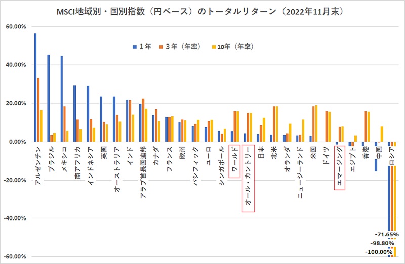 2022年の国別の株式パフォーマンス(MSCI国別指数)をみると、11月末までの過去1年間のトータルリターンで、「アルゼンチン」(56.29%)、「ブラジル」(45.32%)、「メキシコ」(44.73%)のパフォーマンスが際立って高い。「アルゼンチン」は、3年(年率)も33.00%と非常に高く、いわゆる「コロナ・ショック」(2020年3月)からの相場でトップランナーになっている。反対に最悪の結果は「ロシア」で計測不能のマイナスになっている。そのロシアを除くと「中国」がマイナス15.44%で低い。11月の月次パフォーマンスでは「チャイナオープン」が24.95%と全ファンド(純資産10億円以上、DC・SMA専用除く、ブルベア型除く)でトップになるなど中国株ファンドが全般に持ち直している。それでも大きく沈み込んでいるほどに2022年の落ち込みは厳しかった。大きく落ち込んだがゆえに、2023年は中国株が持ち直すという見方も出ている。 パフォーマンスのよかった「アルゼンチン」や「ブラジル」などは、経済基盤が弱く、たびたびデフォルト(債務の支払い延期・停止)を起こし、通貨危機も経験している国だ。アルゼンチンは、近くは2020年に世界的なコロナ危機の最中に国債の利払いを停止してデフォルトに陥った。そして、2001年〜2002年には「アルゼンチン危機」といわれる通貨・債務危機を経験し、アルゼンチン・ペソの大暴落を経験した。ブラジルは2014年から2017年にかけて深刻な経済危機に陥り、2014年から2016年には3年連続でGDPがマイナス成長し、2016年には1200万人が失業するという事態に陥った。この間、株価や通貨は暴落している。このように、足元のパフォーマンスこそ目立っているものの、個別の国に投資するには、大きなリスクがあるといえる。 そこで、一般的には、「アルゼンチン」や「ブラジル」、「メキシコ」、「南アフリカ」、「インドネシア」など足元でパフォーマンスが好調な国々に投資する手段として活用されるのは、新興国を1つのパッケージにした「MSCIエマージング・マーケット・インデックス」、もしくは、新興国も含む全世界の株式に投資する「MSCIオール・カントリー・ワールド・インデックス」に連動するファンドに投資するようにしている。「新興国株式インデックスファンド」、「全世界株式インデックスファンド」などという名称のファンドが数多く設定・運用されている。 「MSCIエマージング・マーケット・インデックス」の構成国は、ブラジル、メキシコ、南アフリカ、インドネシア、中国、インドなど24カ国で構成されている(アルゼンチンは対象外)。その過去1年間(円ベース)のトータルリターンはマイナス1.32%だった。年間リターン45%のブラジルや44%のメキシコ、29%の南アフリカなどが入っているにも関わらず、マイナスのパフォーマンスになったのは、同指数の中核になっている中国がマイナス15%に沈んでいるためだ。同インデックスの国別構成比率は中国が30.4%でトップ、次いで、インドの14.85%、台湾の14.41%、韓国の11.95%で、ブラジルは5.36%にとどまる。一方、新興国を含む全世界に投資する「MSCIオール・カントリー・ワールド・インデックス」になると、新興国最大の中国ですら構成比が3.3%に過ぎず、61.65%を占めるアメリカの影響が大きな指数になってしまう。 その点では、つみたてNISAなども含めて、広く行われるようになっているインデックスファンドの積立投資で使われるのは、「S&P500」(アメリカ株式100%)、「外国株式(先進国株式=MSCIワールド除く日本)」(同73.56%)、「全世界株式」(同61.65%)など、アメリカ株式が中心のインデックスファンドだ。そのアメリカ株式が11月末現在では3.26%とかろうじてプラス圏に顔を出す程度に低迷し、2023年もFRBのかじ取りひとつでリセッション(景気後退)に陥る懸念もある状態で、強気の見通しが聞こえてこない。アメリカの対抗軸になり得る「新興国株式」のカギとなる中国の行方が注目されるゆえんだ。 11月に中国株式が大きく反発したのは、中国政府がかたくなに進めてきた「ゼロコロナ政策」を緩和し、経済再開への地ならしをし始めたというニュースがきっかけだった。中国本土市場(上海、深セン)、香港市場ともに大きな上昇を記録し、そのまま高値圏で越年しそうな気配だ。「MSCI中国」は、過去3年(年率)のリターンもマイナス0.23%で、「コロナ・ショック」直後こそ、他の国をリードする上昇を演じたものの、2021年2月にいち早くピークを付けて、22年10月には「コロナ・ショック」によって下落した水準を下回るほどにまで株価が下落してしまった。ただ、過去1年間が非常に厳しい経済環境を経験してきただけに、利上げを続ける欧米諸国と違って、緩和的な金融政策を続けている国にもなっている。過去1年間に大きく下げただけに、2023年の反発が期待されている。中国は国の方針によって、経済状況が大きく変わる国だけに、今後の中国政府発の情報に注意していきたい。(グラフは、MSCI国別・地域別指数のパフォーマンス)