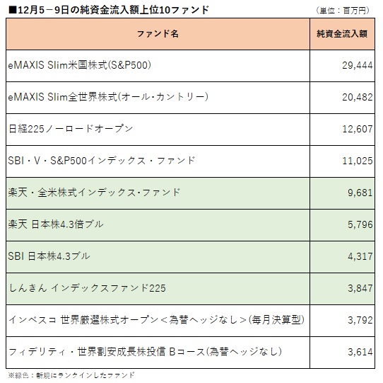 国内公募追加型株式投信(確定拠出年金専用、ファンドラップ専用、及びETF除く)を対象として、ウエルスアドバイザー推計値に基づいて先週(2022年12月5−9日)の純資金流入額上位10ファンドを確認したところ、「eMAXIS Slim米国株式(S&P500)」が11月21−25日以来2週ぶりのトップとなったほか、4ファンドがトップ10内に返り咲いた。 「eMAXIS Slim米国株式(S&P500)」のほかには、「eMAXIS Slim全世界株式(オール・カントリー)」、「日経225ノーロードオープン」、「SBI・V・S&P500インデックス・ファンド」(愛称:SBI・V・S&P500)、「インベスコ 世界厳選株式オープン<為替ヘッジなし>(毎月決算型)」(愛称:世界のベスト)、「フィデリティ・世界割安成長株投信 Bコース(為替ヘッジなし)」(愛称:テンバガー・ハンター)が先々週(2022年11月28日−12月2日)に続いてトップ10入りした。 トップ10内に返り咲いた4ファンドは、11月14−18日以来の「楽天・全米株式インデックス・ファンド」(愛称:楽天・バンガード・ファンド(全米株式))、10月11−14日以来の「楽天 日本株4.3倍ブル」、9月26−30日以来の「SBI 日本株4.3ブル」と「しんきん インデックスファンド225」。 一方、先々週トップ10入りしていたファンドのうち、「ティー・ロウ・プライス 米国オールキャップ株式ファンド」、「netWIN GSテクノロジー株式ファンド Bコース(為替ヘッジなし)」、「SMBC円資産ファンド」、「NWQフレキシブル・インカムファンド 為替ヘッジなし(毎月決算型)」がトップ10圏外となった。
