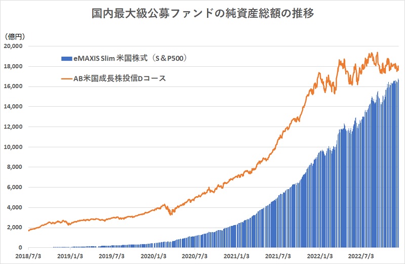 公募ファンド(ETF除く)の現在の残高ナンバーワンは、「アライアンス・バーンスタイン米国成長株投信Dコース(為替ヘッジなし)予想分配金提示型」で純資産総額は1兆7900億円を超えている。歴代のファンドの中でも、株式を対象としたファンドとしては歴代最高を記録した「ピクテ・グローバル・インカム株式ファンド(通称:グロイン)(毎月分配型)」(ピーク時残高約2兆8000億円)に次ぐ史上最高水準の純資産総額に達している。ただ、同じように株式を主要な投資対象とした公募ファンドである「eMAXIS Slim 米国株式(S&P500)」がトップとの差を急速に詰めてきている。12月14日現在で純資産総額は1兆6672億円に達し、「アライアンス・バーンスタイン米国成長株投信Dコース(為替ヘッジなし)予想分配金提示型」を指呼の間に捉えている。「eMAXIS Slim 米国株式(S&P500)」には毎月600億円程度の純資金流入が続いており、トップ逆転は時間の問題といえそうだ。
