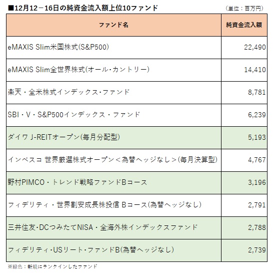 国内公募追加型株式投信(確定拠出年金専用、ファンドラップ専用、及びETF除く)を対象として、ウエルスアドバイザー推計値に基づいて先週(2022年12月12−16日)の純資金流入額上位10ファンドを確認したところ、14日設定の「野村PIMCO・トレンド戦略ファンドBコース」など4ファンドが新規にランクインした。 「野村PIMCO・トレンド戦略ファンドBコース」は、世界各国(新興国を含む)の株式、債券、金利、商品等に関連するデリバティブ取引等を主要取引対象として独自開発の定量モデルを用いたトレーディング戦略を活用して絶対収益の獲得を目指すほか、世界各国(新興国を含む)の債券(国債、政府機関債、社債、モーゲージ証券、資産担保証券等)等に投資する。 このほかには、「ダイワ J−REITオープン(毎月分配型)」、「三井住友・DCつみたてNISA・全海外株インデックスファンド」、「フィデリティ・USリート・ファンドB(為替ヘッジなし)」が新規にランクインした。順に、11月14−18日、10月11−14日、6月6−10日以来のランクインとなった。 純資金流入額トップは「eMAXIS Slim米国株式(S&P500)」。先々週(2022年12月5−9日)に続くトップとなった。このほかには、「eMAXIS Slim全世界株式(オール・カントリー)」、「楽天・全米株式インデックス・ファンド」(愛称:楽天・バンガード・ファンド(全米株式))、「SBI・V・S&P500インデックス・ファンド」(愛称:SBI・V・S&P500)、「インベスコ 世界厳選株式オープン<為替ヘッジなし>(毎月決算型)」(愛称:世界のベスト)、「フィデリティ・世界割安成長株投信 Bコース(為替ヘッジなし)」(愛称:テンバガー・ハンター)が先々週に続いてトップ10入りした。 一方、先々週トップ10入りしていたファンドのうち、「日経225ノーロードオープン」、「楽天 日本株4.3倍ブル」、「SBI 日本株4.3ブル」、「しんきん インデックスファンド225」がトップ10圏外となった。