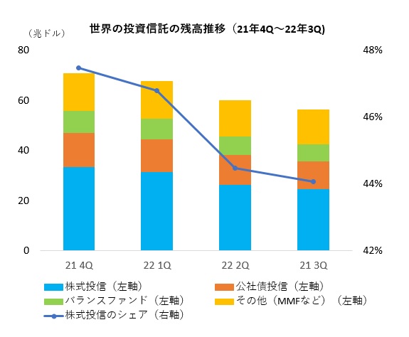 投資信託協会が先日公表した「投資信託の世界統計2022年第3四半期(7月〜9月)」によると、同四半期末の投資信託(株式投信、公社債投信、バランスファンド、MMFなどの合計)の純資産残高は前四半期(2022年第2四半期)末比6.1%減の56兆1870億ドルとなった。主要国の金融引き締め長期化による景気減速懸念から世界的な株安・債券安が続く中、3四半期連続の減少となった。同統計は、国際投資信託協会(IIFA)が46の国・地域から提供されたデータを集計したものである。 株式投信の純資産残高は前四半期末比7.0%減の24兆7680億ドル、公社債投信の純資産残高は同5.4%減の11兆2490億ドル、バランスファンドは同8.9%減の6兆6020億ドルとなり、いずれも3四半期連続で減少した。第3四半期末時点の投信全体の残高に占めるシェアは、株式投信44.1%、公社債投信20.0%、バランスファンド11.8%となった。 第3四半期は投資信託からの資金流出が続いた。投信全体では330億ドルの純資金流出(第2四半期は1460億ドルの純資金流出)となった。株式投信は760億ドルの純資金流出(同690億ドルの純資金流出)、バランスファンドは460億ドルの純資金流出(同510億ドルの純資金流出)となった。一方、公社債投信は410億ドルの純資金流入(同1230億ドルの純資金流出)となった。 第3四半期は、世界の株価動向を示す「MSCIオール・カントリー・ワールド・インデックス」が前四半期末比7.27%下落(第2四半期は同16.13%下落)し、米国株式市場ではNYダウが6.66%下落(同11.25%下落)した。債券も、2022年9月末の米10年債利回りが3.83%と同年6月末の3.01%から上昇(債券価格は下落)した。