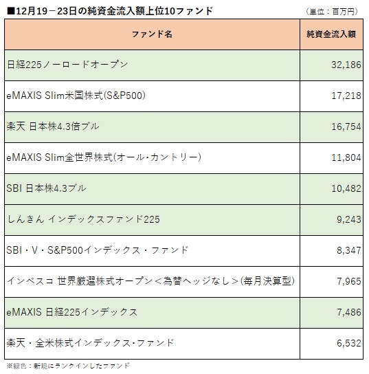 国内公募追加型株式投信(確定拠出年金専用、ファンドラップ専用、及びETF除く)を対象として、ウエルスアドバイザー推計値に基づいて先週(2022年12月19−23日)の純資金流入額上位10ファンドを確認したところ、「日経225ノーロードオープン」が約3カ月ぶりのトップとなった。 「日経225ノーロードオープン」は12月5−9日以来2週ぶりにランクイン。純資金流入額は約322億円で9月26−30日以来のトップとなった。同ファンドのほかには、「楽天 日本株4.3倍ブル」、「SBI 日本株4.3ブル」、「しんきん インデックスファンド225」が2週ぶり、「eMAXIS 日経225インデックス」が2021年以降で初めてのランクインとなった。先週の国内株式は日本銀行の金融緩和策の修正を受けて大幅に下落し、日経平均株価は前週末比▲4.69%となった。先週新たにランクインした5ファンドには、日経平均株価など国内株式の反発を見込んだ資金が流入したもようだ。 先々週(2022年12月12−16日)に続いてランクインしたのは、「eMAXIS Slim米国株式(S&P500)」、「eMAXIS Slim全世界株式(オール・カントリー)」、「SBI・V・S&P500インデックス・ファンド」(愛称:SBI・V・S&P500)、「インベスコ 世界厳選株式オープン<為替ヘッジなし>(毎月決算型)」(愛称:世界のベスト)、「楽天・全米株式インデックス・ファンド」(愛称:楽天・バンガード・ファンド(全米株式))。 一方、先々週トップ10入りしていたファンドのうち、「ダイワ J−REITオープン(毎月分配型)」、「野村PIMCO・トレンド戦略ファンドBコース」、「フィデリティ・世界割安成長株投信 Bコース(為替ヘッジなし)」(愛称:テンバガー・ハンター)、「三井住友・DCつみたてNISA・全海外株インデックスファンド」、「フィデリティ・USリート・ファンドB(為替ヘッジなし)」がトップ10圏外となった。