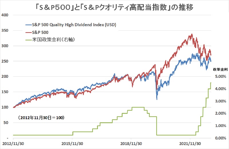 三菱UFJ国際投信は2023年1月12日に「eMAXIS S&P500クオリティ高配当インデックス」を新規設定すると発表した。新ファンドは、「S&P500クオリティ高配当指数(配当込み、円換算ベース)」に連動する値動きをめざす。インデックスファンドを使った積立投資運用においては、同社が提供する「eMAXIS Slim 米国株式(S&P500)」が圧倒的な人気を集めているが、この「S&P500」指数へのインデックス投資を補完する意味のあるファンドとして成長が期待される。 「S&P500クオリティ高配当指数」は、「S&P500」指数の構成銘柄から、クオリティ・スコア、および、配当利回りの基準から、ぞれぞれ上位200位以内にランク付けされる銘柄を抽出し、原則として両方の基準を満たす銘柄を均等に組み入れた指数。クオリティ・スコアは、収益の創出、収益の質、および、財務の健全性の組み合わせとして定義している。米国大型株で構成される「S&P500」の中でも、競争優位性があって事業基盤が確立し、収益がより安定的な企業が選ばれている。 「S&P500」指数の組み入れ上位は、アップル、マイクロソフト、アマゾン、アルファベット(グーグルの持ち株会社)などIT大手企業が上位を占めるが、「S&P500クオリティ高配当指数」では、バイオ医薬品のギリアド・サイエンシズ、自動車用及び工業用交換部品の流通に携わるサービス会社のジェニュイン・パーツ、金融サービス会社のプリンシパル・フィナンシャル・グループなど、上位の顔ぶれが大きく変わってくる。業種別組み入れ比率でみても、「IT」が26.4%、「ヘルスケア」が15.2%、「金融」が11.6%という「S&P500」指数に対し、「S&P500クオリティ高配当指数」は、「金融」が26%、「資本財」13.3%、「生活必需品」が13%という比率であり、「IT」は9.6%しかない。 このような指数の構成銘柄の違いは、パフォーマンスにも表れている。過去10年間のパフォーマンスを振り返ってみると、「S&P500」指数が金利低下局面や低金利下で良いパフォーマンスを記録している一方、「S&P500クオリティ高配当指数」は金利が上昇する局面では「S&P500」を上回るパフォーマンスを残している。足元の状況においても、2022年11月末現在で「S&P500」指数の過去1年間のトータルリターンがマイナス13.1%のところ、「S&P500クオリティ高配当指数」はプラス3.97%と際立った違いを見せている(米ドルベース)。両指数ともに、米国の株式を主要な投資対象としているため、パフォーマンスの傾向は似ているが、局面においてはかなりの差異が乗じる場合がある。それぞれの指数の性格に合わせて使い分けることも可能といえよう。(グラフは、「S&P500」と「S&P500クオリティ高配当指数」のパフォーマンスの推移)