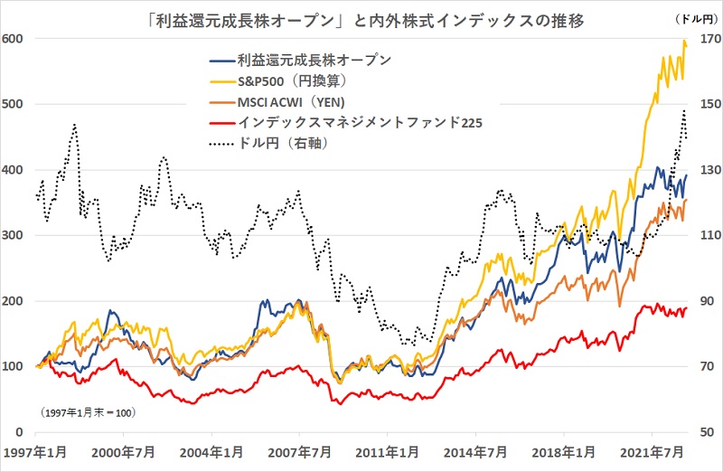 「長期に資産運用をするのであれば、海外の株式インデックスを使った積立投資をすべきである」という考えを信奉する人は少なくない。実際に、過去10年ほどの米国株式市場の上昇率は大きく、大手ネット証券が公表している「積立投資契約件数ランキング」でも上位を占めるのは「S&P500」(米国株式)、「MSCIオール・カントリー」(全世界株式)、「MSCIコクサイ」(日本を除く先進国株式)など海外株式インデックスファンドばかりになっている。しかし、海外資産への投資は為替リスクが避けられない。そして、国内資産である日本株式を主要な投資対象にしていても海外の株価指数を上回るパフォーマンスを残しているファンドもある。2022年は特にドル円の為替変動が大きな1年だったが、2023年も為替が落ち着いた動きになるとは考えにくい。日本株ファンドを検討するタイミングではないだろうか? 資産形成の手段として株式インデックスファンドを使った長期の積立投資を行うことは、非常に良い選択だと考えられる。株式は長期に成長する資産であり、その株式にまとめて投資する株式インデックスは、長期に上昇しているものが多い。しかも、ファンドとして投資する場合のコスト(信託報酬率)もインデックスファンドは非常に低く設定されている。アクティブファンドが年1%程度〜2%程度のコストになる中、インデックスファンドであれば年0.1%程度〜0.5%程度のコストになる。年1%のコスト負担でも40年間投資すれば40%になる。これが年0.1%であれば40年投資しても4%だ。これほど明確なコスト差があるのであれば、インデックスファンドだけを投資対象とし、その中で、どのインデックスに連動するファンドを選択するのかを考える方が良いという考えになるのは当然といえる。 ただ、コストの問題は、コスト控除後のパフォーマンスによって、その多寡の感じ方が大きく変わってくる。たとえば、日本株式を主要な投資対象として長期にわたって優れた運用成績を残してきたアクティブファンド「利益還元成長株オープン(愛称:Jグロース)」は、コスト控除後のパフォーマンスで、国内株式インデックスである日経平均株価に連動するインデックスファンドを大きく上回るパフォーマンスを残してきた。例えば、1997年1月末を100とすると、2022年11月末で「インデックスマネジメントファンド225」は189と89%上昇したことに対し、「利益還元成長株オープン」は391で、291%も上昇している。約25年間の運用で上昇率に3倍以上もの差がついている。コストだけみると、インデックスファンドである「インデックスマネジメントファンド225」は税込み年0.55%で、「利益還元成長株オープン」の同0.9%の半分程度になり優位なのだが、圧倒的なパフォーマンスの差がコスト差を吹っ飛ばしてしまう。 そして、この「利益還元成長株オープン」のパフォーマンスは、海外インデックスと比較しても、十分に魅力的な水準になっている。たとえば、新興国を含む世界の株式を対象としたインデックス「MSCI ACWI(オール・カントリー・ワールド・インデックス)」(円ベース)と比較すると、1997年1月から2022年11月末までの運用成績で「利益還元成長株オープン」が勝っている。「S&P500」(円換算ベース)には大きく負けてしまっているが、1998年11月〜2000年1月、2003年4月〜2006年4月など、円高局面などにおいては「S&P500」を凌駕するパフォーマンスにもなっている。2011年以降の10年程度の期間は、「S&P500」が圧倒的なパフォーマンスをみせたため、現時点から振り返ると「S&P500」の優位性が際立って感じられるが、2010年くらいまでのパフォーマンスは一進一退で、どちらが良いとは言い切れない。 このように、20年を超えるような長期のパフォーマンスを振り返ると、足元の3年〜5年の印象とは異なることが見えてくる。資産運用に「絶対」ということはない。その時々の市場環境を把握して、リスクがより小さく、かつ、値上がりの期待が持てる資産を柔軟に選択していくことが重要だ。米国が逆イールド(長短金利差の逆転)になり将来の景気減速が懸念され、日米の金融政策が転換期を迎えて為替の変動が大きくなりがちな今、日本株式への投資は検討の価値がある選択肢だと感じられる。「利益還元成長株オープン」のように、ファンドレーティングで5ツ星、または、4ツ星にレーティングされるような、同一カテゴリー内で比較優位なパフォーマンスを残してきたアクティブファンドには魅力的に感じられるファンドが少なくない。ファンドの運用方針等を確認し、納得のできる内容であれば、ポートフォリオに加えることを検討したい。(グラフは、「利益還元成長株オープン」と内外株式インデックスの推移)
