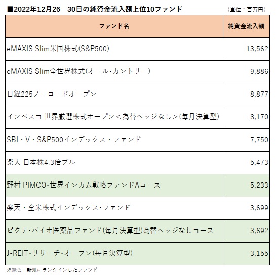 国内公募追加型株式投信(確定拠出年金専用、ファンドラップ専用、及びETF除く)を対象として、ウエルスアドバイザー推計値に基づいて先週(2022年12月26−30日)の純資金流入額上位10ファンドを確認したところ、「野村 PIMCO・世界インカム戦略ファンドAコース」など3ファンドが新規にランクインした。 「野村 PIMCO・世界インカム戦略ファンドAコース」は2021年以降で初のランクインとなった。同ファンドは、新興国を含む世界各国の債券等(国債、政府機関債、社債、モーゲージ証券、資産担保証券、ハイ・イールド債券、バンクローン等)および派生商品に実質的に投資する。Aコースは為替ヘッジあり(部分ヘッジ(高位))で年2回決算。ほかには、為替ヘッジなしで年2回決算のBコース、為替ヘッジあり(部分ヘッジ(高位))で毎月決算のCコース、為替ヘッジなしで毎月決算のDコースがある。 同ファンドのほかには、「ピクテ・バイオ医薬品ファンド(毎月決算型)為替ヘッジなしコース」、「J−REIT・リサーチ・オープン(毎月決算型)」が新規にランクインした。いずれも11月21−25日以来1カ月ぶりにランクインした。 先週の純資金流入額トップは「eMAXIS Slim米国株式(S&P500)」で2週ぶりのトップとなった。同ファンドのほかには、「eMAXIS Slim全世界株式(オール・カントリー)」、「日経225ノーロードオープン」、「インベスコ 世界厳選株式オープン<為替ヘッジなし>(毎月決算型)」(愛称:世界のベスト)、「SBI・V・S&P500インデックス・ファンド」(愛称:SBI・V・S&P500)、「楽天 日本株4.3倍ブル」、「楽天・全米株式インデックス・ファンド」(愛称:楽天・バンガード・ファンド(全米株式))が先々週(2022年12月19−23日)に続いてトップ10入りした。 一方、先々週トップ10入りしていたファンドのうち、「SBI 日本株4.3ブル」、「しんきん インデックスファンド225」、「eMAXIS 日経225インデックス」がトップ10圏外となった。