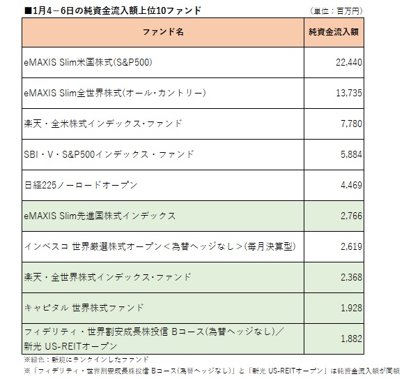 国内公募追加型株式投信(確定拠出年金専用、ファンドラップ専用、及びETF除く)を対象として、ウエルスアドバイザー推計値に基づいて先週(2023年1月4−6日)の純資金流入額上位10ファンドを確認したところ、「eMAXIS Slim先進国株式インデックス」など5ファンドが新規にランクインした。 「eMAXIS Slim先進国株式インデックス」は2022年10月3−7日以来のランクイン。ほかには、「楽天・全世界株式インデックス・ファンド」(愛称:楽天・バンガード・ファンド(全世界株式))が同9月12−16日以来、「キャピタル 世界株式ファンド」が同11月7−11日以来、「フィデリティ・世界割安成長株投信 Bコース(為替ヘッジなし)」(愛称:テンバガー・ハンター)が同12月12−16日以来のランクイン。「新光 US−REITオープン」(愛称:ゼウス)は2022年以降で初めてのランクインとなった。 先週の純資金流入額トップは「eMAXIS Slim米国株式(S&P500)」。224億円の純資金流入となり、先々週(2022年12月26−30日)に続いて2週連続のトップとなった。ほかには、「eMAXIS Slim全世界株式(オール・カントリー)」、「楽天・全米株式インデックス・ファンド」(愛称:楽天・バンガード・ファンド(全米株式))、「SBI・V・S&P500インデックス・ファンド」(愛称:SBI・V・S&P500)、「日経225ノーロードオープン」、「インベスコ 世界厳選株式オープン<為替ヘッジなし>(毎月決算型)」(愛称:世界のベスト)が先々週に続いてランクインした。 一方、先々週トップ10入りしたファンドのうち、「楽天 日本株4.3倍ブル」、「野村 PIMCO・世界インカム戦略ファンドAコース」、「ピクテ・バイオ医薬品ファンド(毎月決算型)為替ヘッジなしコース」、「J−REIT・リサーチ・オープン(毎月決算型)」がトップ10圏外となった。
