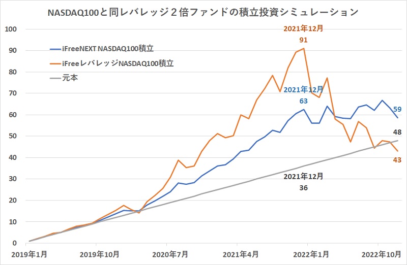2022年のファンド年間トータルリターンを比較してみると、いわゆる「レバレッジ型(ブル型=指数の上昇時に指数の変動率を増幅する)」のファンドが大幅なマイナスリターンに沈んでいることが目立つ。原指数がマイナスに落ち込む中で、その下落率を増幅して被ったため、大きな下落率になった。反対に、レバレッジ型でも「ベア型(指数の動きと反対方向に動く)」は「NASDAQ100 3倍ベア」が全ファンド(CD・SMA専用、ETF除く)の中で第3位になるプラス99.99%のリターンを実現した。レバレッジ型は、その値動きの大きさを利用した積立効果を狙うツールとしても活用され、近年では残高が1000億円を超えるほどに大型化したものもある。ファンドの運用記録が3年を超えるファンドも増えたため、その積立効果を検証してみた。 検証に使ったのは、米国の「NASDAQ100」指数に連動する運用成果をめざす「iFreeNEXT NASDAQ100」と、日々の基準価額の値動きを「NASDAQ100」指数の2倍程度となることをめざす「iFreeレバレッジNASDAQ100」(通称「レバナス」の1つ)で、それぞれ2019年1月末から22年12月末までの4年間で比較した。 4年間の積立投資結果だけをみると、「レバナス」を使った積立は、2022年12月末現在で積立元本の48万円を下回る評価額43万円に沈んでしまった。2022年11月末までは、積立元本とほぼ等しい評価額をキープすることができていたが、12月末になって元本価格水準を明確に割り込んでしまった。基準価額の水準だけで見れば、投資開始の2019年1月末が9014円で、22年12月末は1万6081円であるため、基準価額はプラス78%の水準にあるのだが、2021年12月(基準価額は4万2484円)に向けた大きな上昇相場を経験する中で、高い価格帯でも積立投資を続けていたため、過去4年間での累計積立評価額は、投資元本を下回る結果になった。基準価額のピーク(21年12月末)から22年12月末までマイナス62%と大きく下落したことが響いた。 これに対して、レバレッジをかけていない「iFreeNEXT NASDAQ100」の22年12月末時点の積立評価額は59万円と、積立元本(48万円)を上回っている。ファンドの基準価額は21年12月末に対して、22年12月末はマイナス23%の水準にあるが、積立評価額が積立元本を下回っていないことは、安心感につながっているだろう。 そもそも米国のNASDAQ市場はハイテク株の比率が高く、ボラティリティ(価格変動率)が大きな市場として知られている。2022年の株価指数の年間騰落率でみても、「NYダウ」がマイナス8.78%、「S&P500」がマイナス19.44%だったことに対し、「NASDAQ100」はマイナス32.97%と大きな下落率になった。この大きな値動きが、等金額投資による積立投資にあっては、価格下落時に大きな量(口数)を買い溜める効果となって、株価が反転する時に大きなリターンとして返ってくる効果を高めるという期待につながっていた。しかし、さすがに原指数が30%以上の値下がりとなり、それにレバレッジをかけて60%以上も基準価額が下落してしまうと、積立資産評価額も大きな下落に見舞われてしまうことが明確に示された。 ただ、「レバナス」を使った積立投資で、指数が大きく値上がりした2021年12月末までの過程は、非常に有効な積立効果が得られた期間として記憶されていいだろう。21年12月末時点の積立評価額は91万円に達し、積立元本(36万円)の2.5倍に膨らんでいた。資金効率を最大にするには、21年12月末でいったん現金化し、その後、引き続き積立投資を継続していれば、22年12月末で合算した評価額は100万円になっている計算になる。将来の株価を予測することは誰にもできないため、このような計算はあまり意味がないかもしれないが、「レバナス」のような大きな価格変動がある商品を使う場合は、ただ漫然と積立投資を続けるのではなく、大きな市場の流れをしっかり把握しておく努力も必要といえるだろう。また、今回の過去4年間の検証では、積立評価がマイナスに落ち込んでしまった事実を踏まえれば、積立投資期間は、4年の2倍の8年以上の長期で積立投資を行うべきだといえそうだ。 レバレッジ型のファンドは、非常に大きな値動きになる傾向があるため、価格変動リスクを抑える効果があるとされる積立投資においても、5年以下の期間では価格下落のマイナス分をカバーできないことがある。投資対象を選定する時には、過去のパフォーマンスについて様々な角度からシミュレーションを行った上で、その結果としての評価額の目減り額を自身で受け止める覚悟があるのか、事前に検討した上で投資をスタートしたい。数多くのインデックスファンドが設定されて3年以上が経過したことで、中期的なシミュレーションができるようになったことを活用したい。(グラフは、「NASDAQ100」のインデックスファンドと「レバナス」の積立投資シミュレーション)